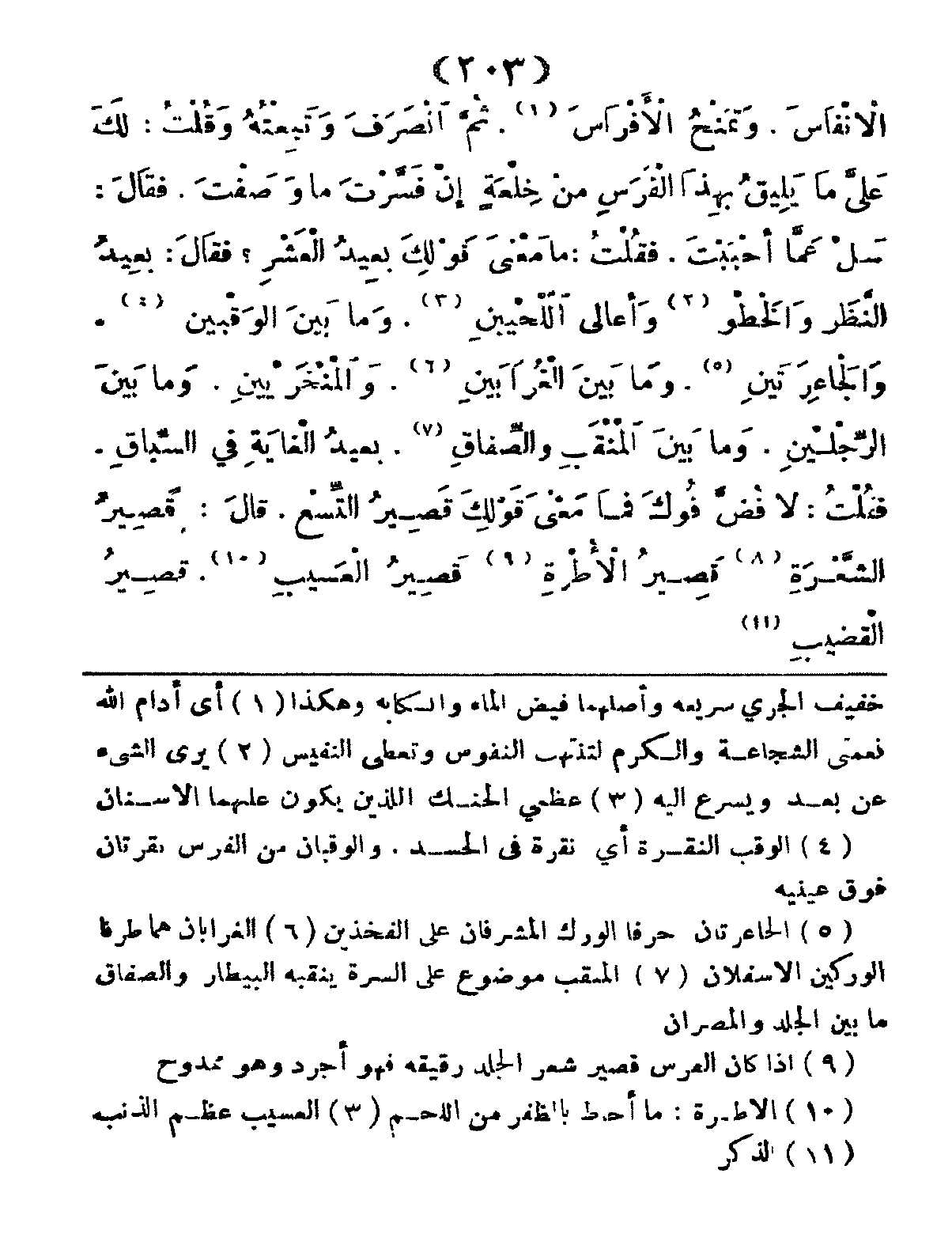 الأَنْفَاسَ، وَتَمْنَحُ الأَفْرَاسَ، ثُمَّ انْصَرَفَ وَتَبِعْتُهُ وَقُلْتُ لَكَ عَلَيَّ مَا يَلِيقُ بِهَذا الفَرَسِ، ثُمَّ انْصَرَفَ وَتَبِعْتُهُ وَقُلْتُ لَكَ عَلَيَّ مَا يَلِيقُ بِهذَا الفَرَسِ مِنْ خِلْعَةٍ إِنْ فَسَّرْتَ مَا وَصَفْتَ، فَقَالَ: سَلْ عَمَّا أَحْبَبْتَ، فَقُلتُ: مَا مَعْنَى قَوْلِكَ بَعِيدُ العَشْرِ، فقَالَ: بَعِيدُ النَّظَرِ وَالْخَطْوِ وَأَعَالِي اللَّحْيَيْنِ، وَمَا بَيْنَ الوَقْبَيْينِ، وَالجَاعِرَتَيِنِ، وَمَا بَيْنَ الغُرَابَيْنِ وَالمِنْخَرَيْنِ، وَمَا بَيْنَ الرِّجْلَيْنِ، وَمَا بَيْنَ المَنْقَبِ وَالصِّفَاقِ، بَعِيدُ الغَايَةِ فِي السِّبَاقِ، فَقُلْتُ: لاَ فُضَّ فُوكْ فَمَا مَعْنَى قَوْلِكَ قَصِيرُ التِّسْعِ، قَالَ: قصِيرُ الشَّعْرَةِ قَصِيرُ الأُطْرَةِ قَصِيرُ العَسِيْبِ،