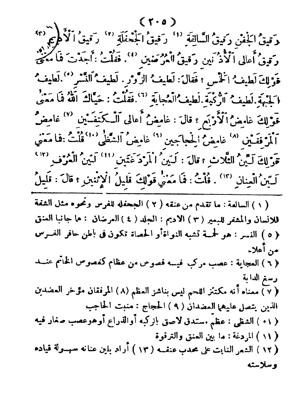 قَالَ: غَامِضُ أَعَالشي الكَتِفَيْنِ، غَامِضُ المَرْفَقَيْنِ، غَامِضُ الحِجَاجَيْن، غَامِضُ الشَّظى. قُلْتُ: فَمَا مَعْنَى قَوْلِكَ لَيِّنُ الثَّلاَثِ، قَالَ: لَيِّنُ الْمَرْدَغَتَيْنِ لَيِّنُ العُرْفِ لَيِّنُ العِنَانِ قُلْتُ: فَمَا مَعْنَى قَوْلِكَ قَلِيلُ الإِثْنَثْنِ قَالَ: قَلِيلُ