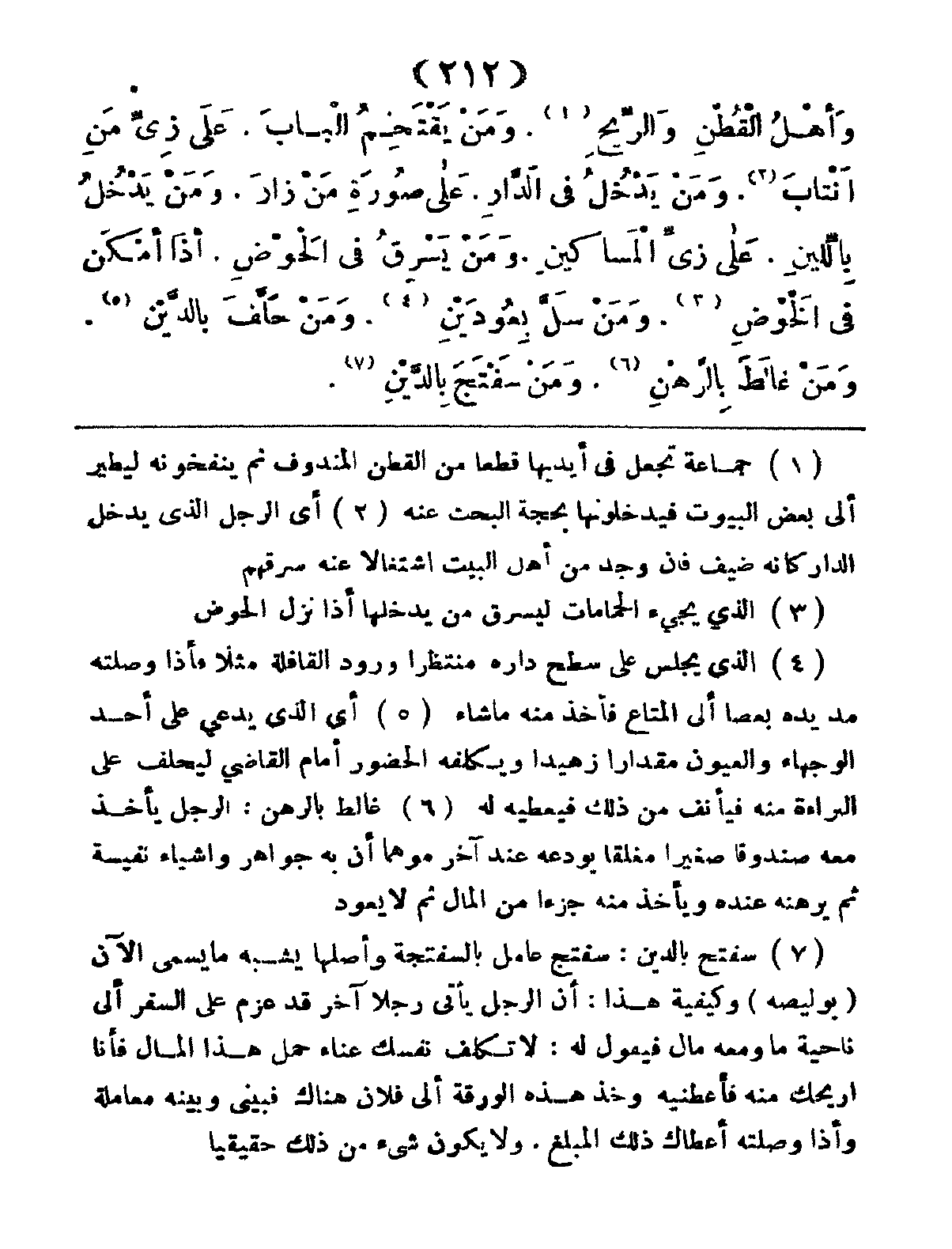 وَأَهْلَ القُطْنِ وَالرِّيحِ، وَمَنْ يَقْتَحِمُ البَابَ، علَى زِيِّ مَنِ انْتَابَ، وَمَنْ يَدْخُلُ فِي الدَّارِ، عَلَى صُورَةِ مَنْ زَارَ، وَمَنْ يَدْخُلُ بِالِّلينِ، عَلَى زِيِّ المَسَاكِينِ، وَمَنْ يَسْرِقُ فِي الحَوْضِ، إِذَا أَمْكَنَ فِي الخَوْضِ، وَمَنْ سَلَّ بِعُودَيْنِ، وَمَنْ حَلَّفَ بِالدَّيْنِ، وَمَنْ غَالَطَ بِالرَّهْنِ، وَمَنْ سَفْتَجَ بِالدَّيْنِ،