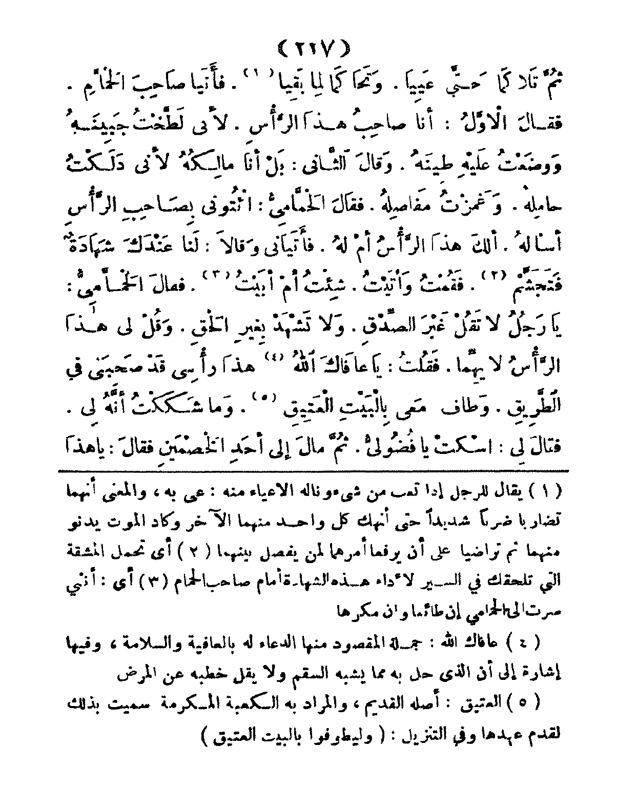 ثُمَّ تَلاكَمَا حّتَّى عَيِيَا، وَتَحَاكَمَا لِما بَقِيا، فَأَتَيا صَاحِبَ الحَمَّامِ، فَقَالَ الأَوَّلُ: أَنَا صَاحِبُ هَذا الرَّأْسِ؛ لأَنِّي لَطَّخْتُ جَبِينَهُ، وَوَضَعْتُ عَلَيْهِ طِيَنهُ، وَقَالَ الثَّاني: بَلْ أَنَا مَالِكُهُ؛ لأَنشي دَلَكْتُ حَامِلَهُ، وَغَمَزْتُ مَفَاصِلَهُ، فَقَالَ الحَمَّامِيُّ: ائْتُونِي بِصَاحِبِ الرَّأْسِ أَسْأَلهُ، أَلَكَ هذَا الرَّأْسُ أَمْ لَهُ، فَأَتَيَانِي وَقَالا: لَنَا عِنْدَكَ شَهَادَةٌ فَتَجَشَّمْ، فَقُمْتُ وَأَتَيْتُ، شِئْتُ أَمْ أَبَيْتُ، فَقَالَ الحَمَّامِي: يَا رَجُلُ لاَ تَقُل غَيْرَ الصِّدْقِ، وَلا تَشْهَدْ بِغَيْرِ الحَقِّ، وَقُلْ لِي: هذَا الرَّأْسُ لأيِّهِمَا، فَقُلْتُ: يَا عَافَاكَ اللهُ هذَا رأْسِي، قَدْ صَحِبَنِي فِي الطَّرِيقِ، وَطَافَ مَعِي بِالْبَيْتِ العَتِيقِ، وَمَا شَككْتُ أَنَّهُ لِي، فَقالَ لِي: اسْكُتْ يِا فُضُولِيُّ، ثُمَّ مالَ إِلى أَحَدِ الخَصْمَيَنِ فَقَالَ: يَا هَذَا