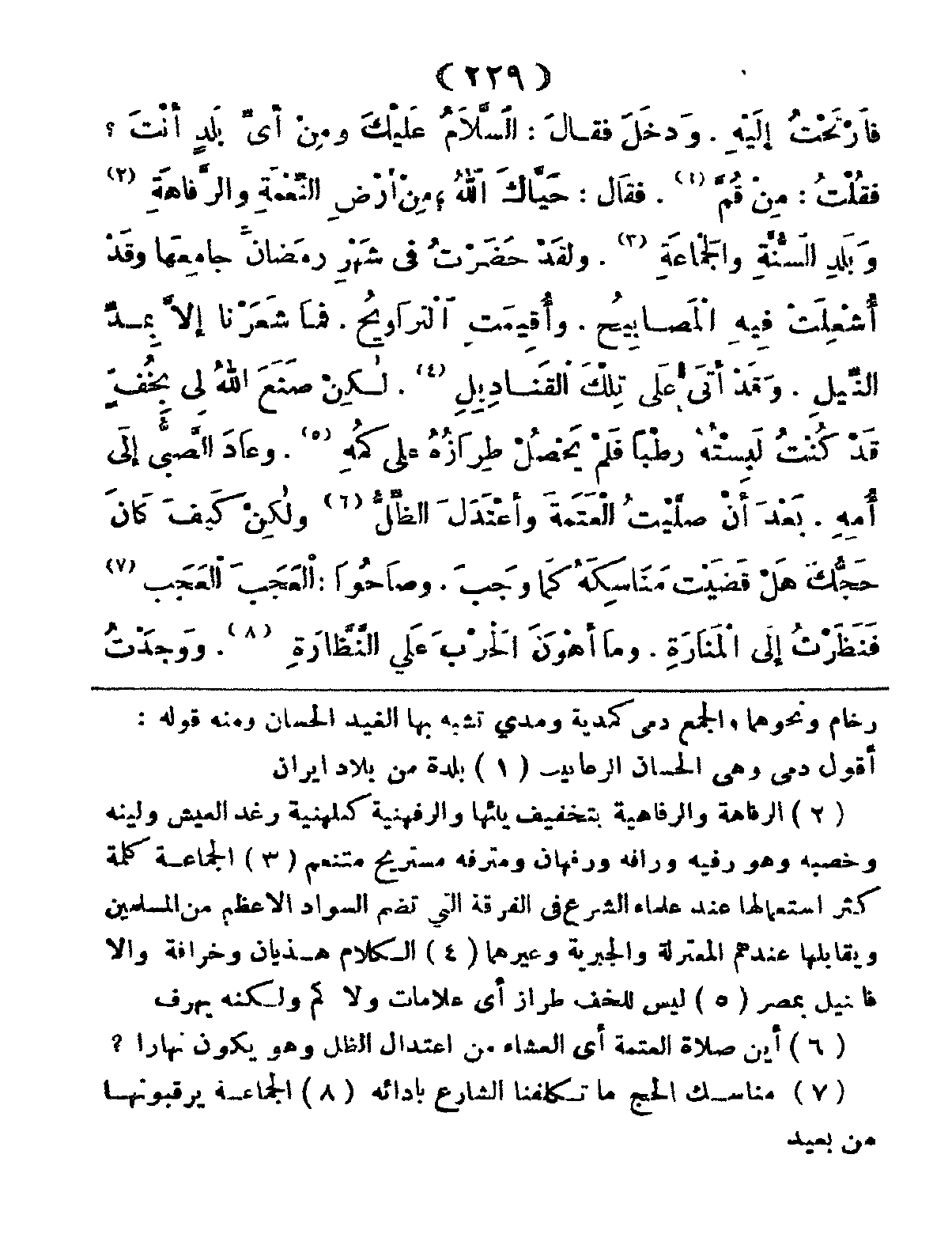فارْتَحْتُ إِلَيْهِ، وَدَخَلَ فَقَالَ: السَّلاَمُ عليْكَ، وَمِنْ أَيِّ بَلَدٍ أَنْتَ؟ فَقُلْتُ: مِنْ قُمَّ، فَقَالَ: حَيَّاكَ اللهُ! مِنْ أَرْضِ النِّعْمَةِ وَالرَّفَاهَةِ وَبَلَدِ السُّنَّةِ وَالجَمَاعَةِ، وَلَقَدْ حَضَرْتُ فِي شَهْرِ رَمضانَ جَامِعَها وَقَدْ أُشْعِلَتْ فِيهِ المَصَابِيحُ، وَأُقِيَمتِ التَّرَاويحُ، فَمَا شَعَرْنا إِلاَّ بِمَدِّ النِّيلِ، وَقَدْ أَتَى عَلَى تِلْكَ القَنَادِيلِ، لكِنْ صَنَعَ اللهُ لِي بِخُفِّ قَدْ كُنْتُ لَبِسْتُهُ رطْباً فَلَمْ يَحْصُلْ طِرَازُهُ على كُمِّهِ، وَعَادَ الصَّبيُّ إِلِى أُمِّهِ، بَعْدَ أَنْ صَلَّيْتُ العَتَمَةَ واعْتَدَلَ الظِّلُّ، وَلَكِنْ كَيفَ كَانَ حَجُّكَ؟ هَلْ قَضَيْتَ منَاَسِكَهُ كَما وَجَبَ، وَصَاحُوا العَجَبَ العَجَبَ؟ فَنَظَرْتُ إِلى المَنَارَةِ، وَمَا أَهْوَنَ الحَرْبَ عَلى النَّظَّارَةِ، وَوجَدْتُ