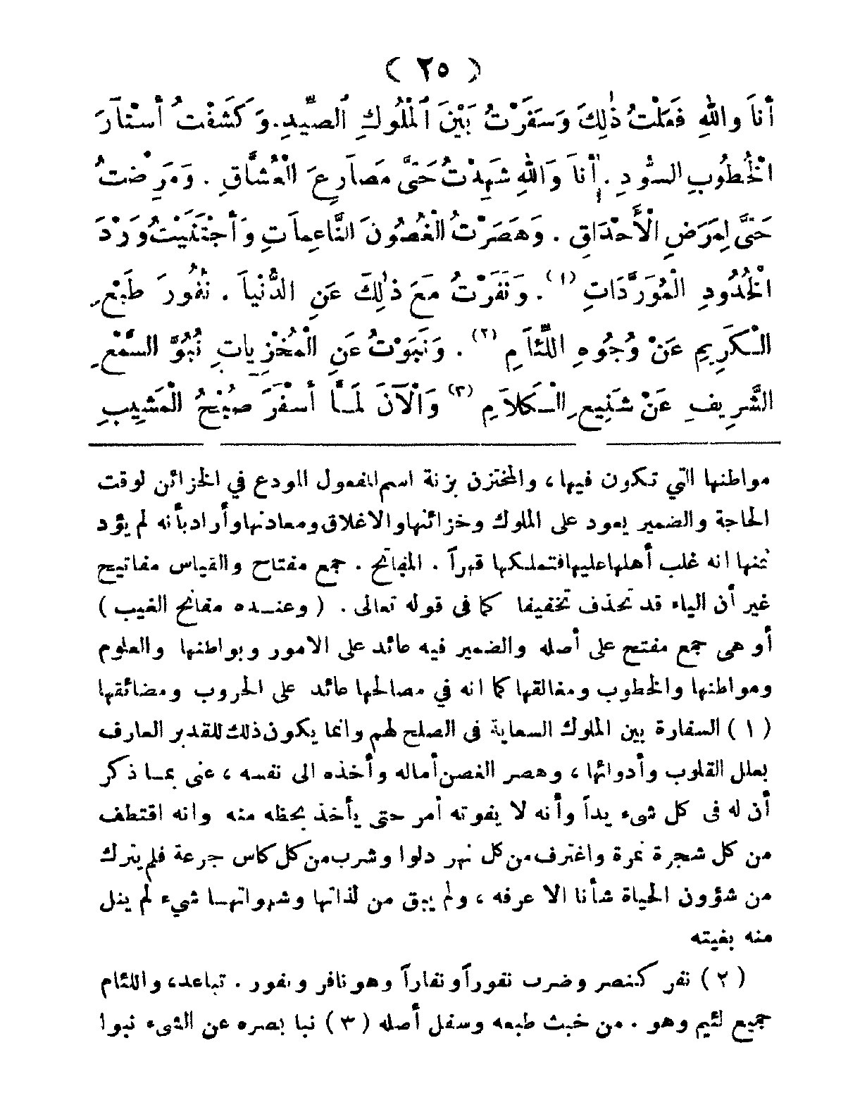 أَنَا وَاللهِ فَعَلْتُ ذلِكَ، وَسَفَرْتُ بَيْن المُلُوكِ الصِّيدِ، وَكَشْفُت أَسْتَارَ الخُطُوبِ السُّودِ، أَنَا وَاللهِ شَهِدْتُ حَتّى مَصارِعَ العُشَّاقِ، وَمَرِضْتُ حَتَّى لِمَرَضِ الأَحْدَاقِ، وَهَصَرْتُ الغُصُونَ النَّاعِماتِ، وَأَجْتَنَيْتُ وَرْدَ الْخُدُودِ الْمُوَرَّداتِ، وَنَفَرْتُ مَعَ ذَلِكَ عَنْ الدُّنْيَا نُفُورَ طَبْعِ الْكَرِيمِ عَنْ وُجُوهِ اللِّئَامِ، وَنَبَوتُ عَنْ الْمُخْزِياتِ نُبُوَ السَّمْعِ الشَّريفِ عَنْ شَنْيعِ الْكَلامِ وَالآنَ لَمَّا أَسْفَرَ صُبْحُ الْمَشِيبِ،