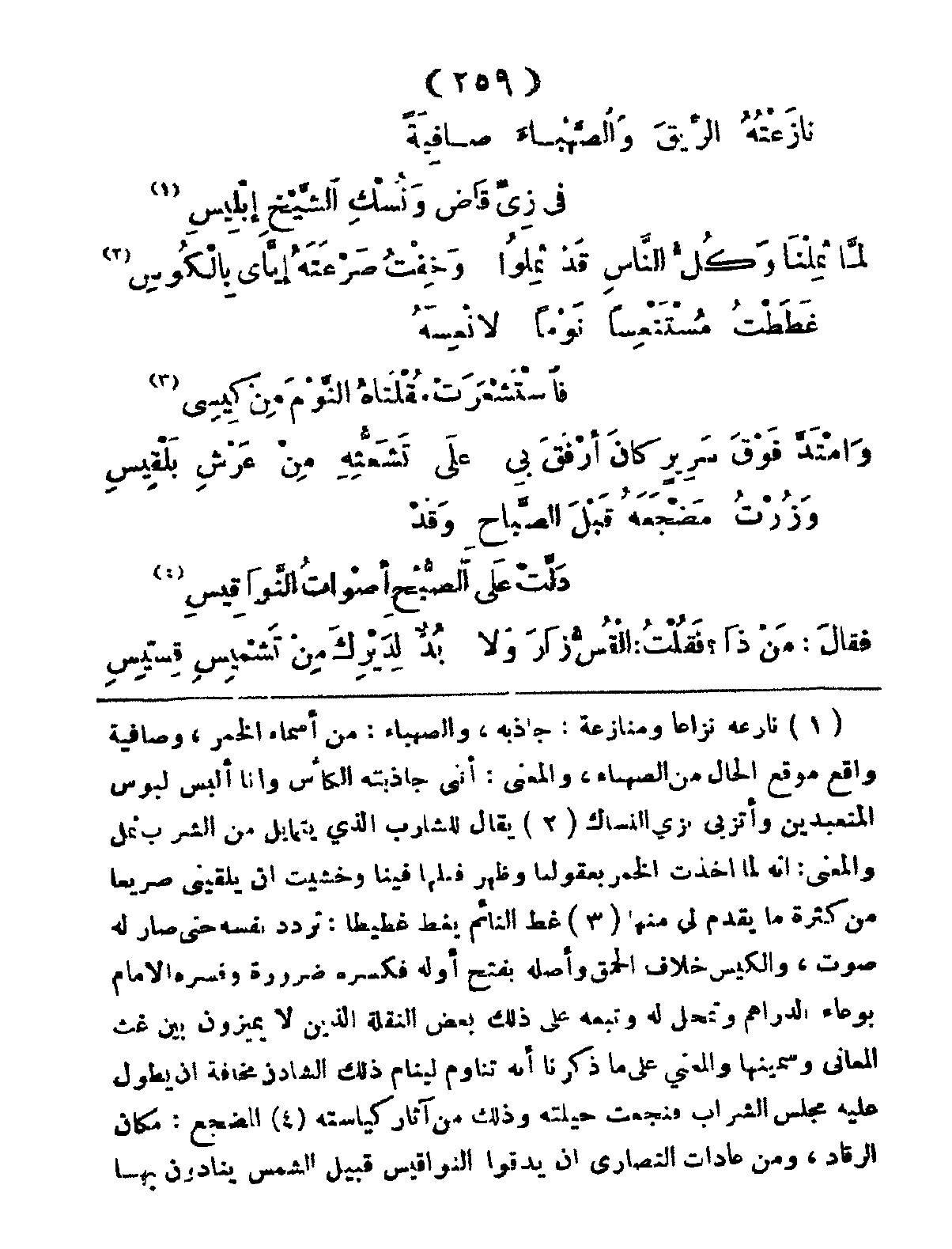 نَازَعْتُهُ الرِّيقَ وِالصَّهْبَاءَ صَافِيَةًَفِي زيِّ قَاضٍ وَنُسْكِ الشَّيْخِ إِبْلِيسِ