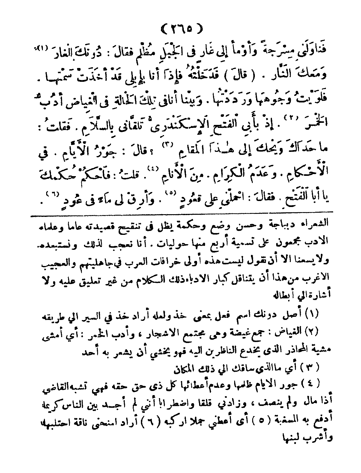 فَنَاوَلنِي مِسْرَجَةً، وَأَوْمَأَ إِلَى غَارٍ فِي الجَبَلِ مُظْلِمٍ، فَقَالَ: دُونَكَ الغَارَ، وَمَعكَ النَّار، قَالَ: فَدَخَلْتُهُ فَإِذَا أَنَا بإِبِلي قَدْ أَخَذَتْ سَمْتَهَا، فَلَوَيْتُ وَجُوهَهَا وَرَدَدْتُهَا، وَبَيْنَا أَنَا في تِلْكَ الحَالةِ في الغِيَاضِ أَدُبُّ الخَمَرَ، إِذْ بِأَبِي الفَتْحِ الإِسْكَنْدَرِيِّ تَلَقَّانِي بِالسَّلاَمش، فَقُلْتُ: مَا حَدَاكَ وَيْحَكَ إِلَى هَذَا المَقامِ؟ قَالَ: جَوْرُ الأَيَّامِ، فِي الأَحْكَامِ، وَعَدَمُ الكِرَامِ، مِنَ الأَنَامِ، قُلتُ: فَاحْكُمْ حُكْمَكَ يا أَبَا الفَتْحِ، فَقَالَ: احْمِلنِي عَلَى قَعُودٍ، وَأَرِقْ لي مَاءً فِي عُودٍ،