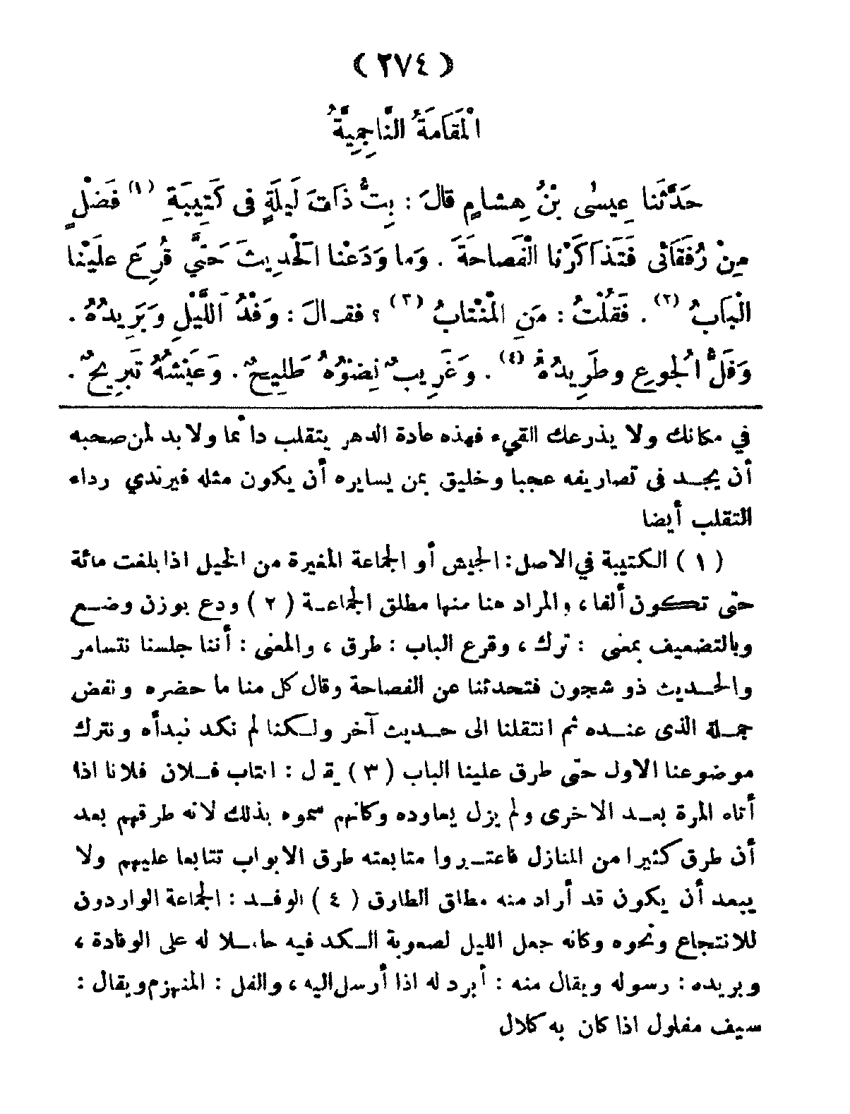 حَدَّثَنا عِيسَى بْنُ هِشَامٍ قَالَ: بِتُّ ذَاتَ لَيْلةٍ في كَتِيبَةِ فَضْلٍ مِنْ رُفَقَائِي، فَتَذَاكَرْنَا الفَصَاحَةَ، وَمَا وَدَّعْنَا الحَدِيثَ حَتَّى قُرِعَ عَلَيْنَا البَابُ، فَقُلْتُ: مَنِ المُنْتَابُ؟ فَقَالَ: وَفْدُ الَّليْلِ وَبَرِيدُهُ، وَفَلُّ الجُوعِ وَطَرِيدُهُ، وَغَرِيبٌ نِضْوُهُ طَلِيحُ وَعَيْشُهُ تَبْرِيحٌ،
