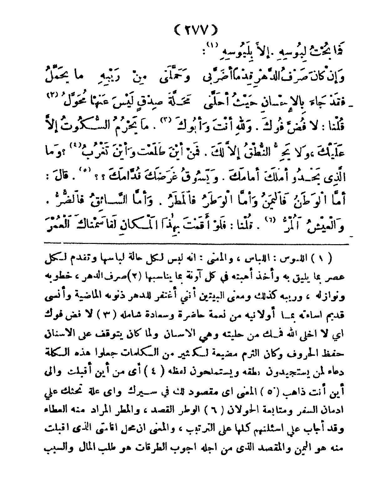 قُلْنَا: لا فُضَّ فُوكَ، واللهِ أَنْتَ وَأَبْوكَ، مَا يَحْرُمُ السُّكُوتُ إِلاَّ عَلَيْكَ، وَلا يَحِلُّ النُّطْقُ إِلاَّ لَكَ، فَمِنْ أَيْنَ طَلَعْتَ؟ وَأَيَْ تَغْرُبُ؟ وَمَا الَّذِي يَحْدُو أَمَلَكَ أَمَامَكَ، وَيَسُوقُ غَرَضَكَ قُدَّامَكَ؟؟ قَالَ: أَمَّا الوَطَنُ فَاليَمَنُ، وَأَمَّا الوَطَرُ فَالمَطَرُ، وَأَمَّا السَّائِقُ فَالضُّرُّ، وَالْعَيْشُ المُرُّ، قُلْنَا: فَلَوْ أَقَمْتَ بِهَذَا المَكَانِ لَقَاسَمْنَاكَ العُمْرَ