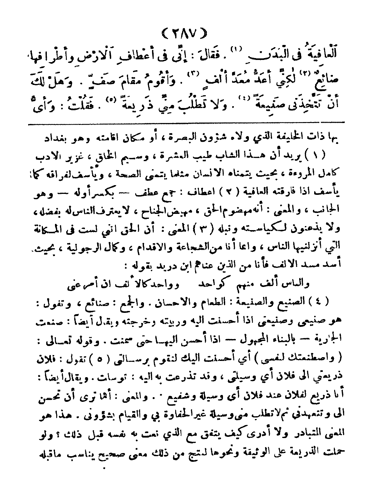 العَافيَةُ فَي البَدَنِ، فَقَالَ: إِنِّي في أَعْطَافِ الأَرْضِ وَأَطْرَافِهَا ضَائِعٌ، لَكِنِّي أُعَدُّ مُعَدَّ أَلْفٍ، وَأَقُومُ مَقَامَ صَفٍّ، وَهَلْ لَكَ أَنْ تَتَّخِذَني صَنِيعَةً، وَلا تَطْلُبَ مِنِّي ذَرِيعَةً، فَقُلْتُ: وَأَيُّ