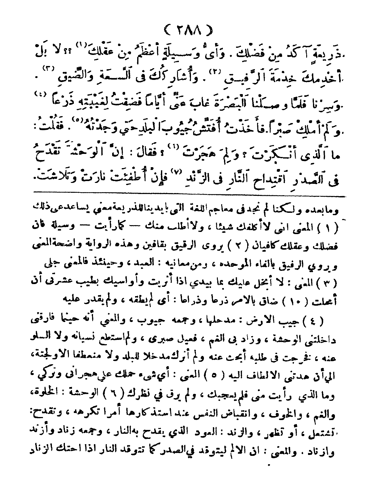 ذَرِيعَةٍ آكَدُ مِنْ فَضْلِكَ؟ وَأَيُّ وَسِيلَةٍ أَعْظَمُ مِنْ عَقْلِكَ؟؟ لا بَلْ أَخْدِمُكَ خِدْمَةَ الرَّفِيقِ، وَأَشَارِكُكَ في السَّعَةِ وَالضِّيقِ، وَسِرْنَا فَلَمَّا وَصَلْنَا البَصْرَةَ غَابَ عَنِّي أَيَّامَاً، فَضِقْتُ لِغَيْبَتِهِ ذَرْعاً، وَلَمْ أَمْلِكْ صَبْراً، فَأَخَذْتُ أُفَتِّشُ جُيُوبَ البَلَدِ حَتَّى وَجَدْتُهُ، فَقُلْتُ: مَا الَّذِي أَنْكَرْتَ؟ وَلِمَ هَجَرْتَ؟ فَقَالَ: إِنَّ الوَحْشَةَ تَقْدَحُ فِي الصَدْرِ اقْتِدَاحَ النَّارِ فِي الزَّنْدِ، فَإِنْ أُطْفِئَتُ بَادَتْ وَتَلاشَتْ،
