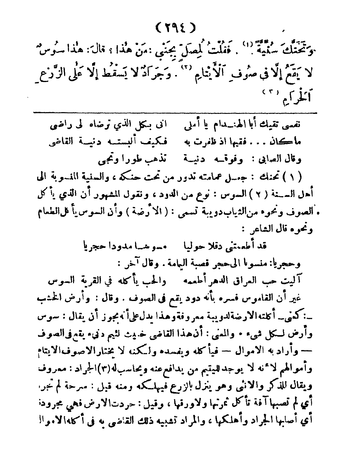 وَتَحَنَّكَ سُنِّيَّةً، فَقُلْتُ لِمُصَلٍّ بِجَنْبي: مَنْ هَذا؟ قَالَ: هَذا سُوسٌ لا يَقَعُ إِلاَّ فِي صُوفِ الأَيْتامِ، وَجَرَادٍ لا يَسْقُطُ إِلاَّ عَلى الزَّرْعِ الحَرَامِ