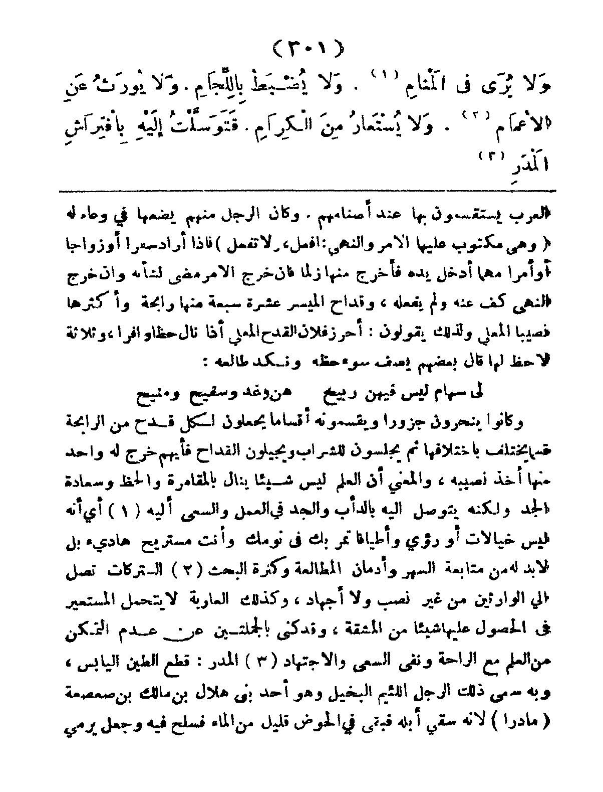 وَلا يُرَى في المَنَامِ، وَلا يُضْبَطُ بِالِّلجَامِ، وَلا يُورَثُ عَنِ الأَعْمَامِ، وَلا يُسْتَعَارُ مِنَ الكِرَامِ، فَتَوَسَّلْتُ إِلَيْهِ بِافْتِرَاشِ المَدَرِ،