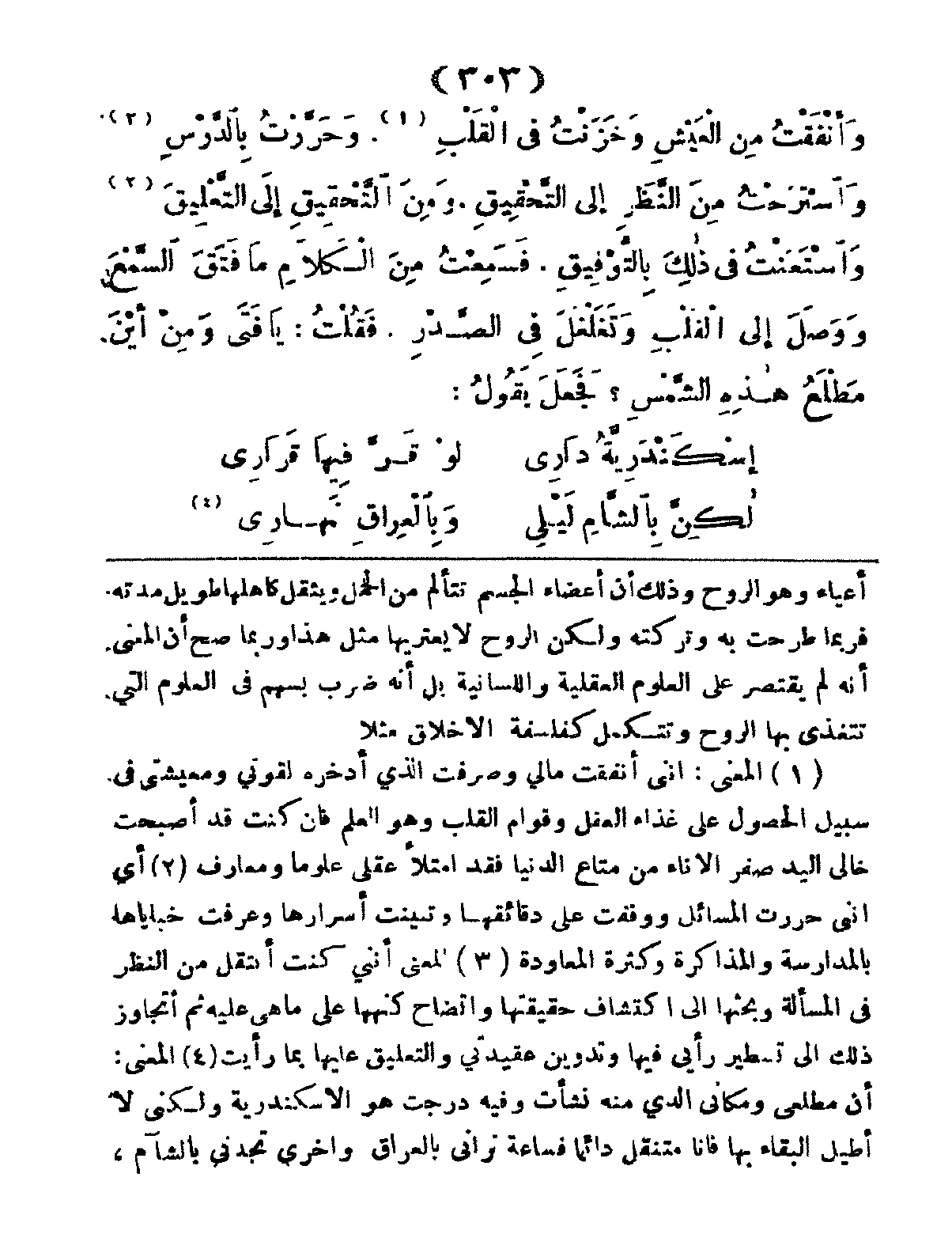 وَأَنْفَقْتُ مِنَ العَيْشِ، وَخَزَنْتُ فِي القَلْبِ، وَحَرَّرْتُ بِالدَّرْسِ، وَاسْتَرَحْتُ مِنَ النَّظَرِ إِلى التَّحْقِيقِ، وِمِنَ التَّحْقِيقِ إِلى التَّعْلِيقِ، وِاسْتَعَنْتُ فِي ذَلِكَ بِالتَّوْفِيقِ، فَسَمِعْتُ مِنَ الكَلامِ مَا فَتَقَ السَّمْعَ وَوَصَلَ إِلَى القَلْبِ وَتَغَلْغَلَ فِي الصَّدْرِ، فَقُلْتُ: يَا فَتَى، وَمِنْ أَيْنَ مَطْلَعُ هَذِهِ الشَّمْسِ؟ فَجَعَلَ يَقُولُ: