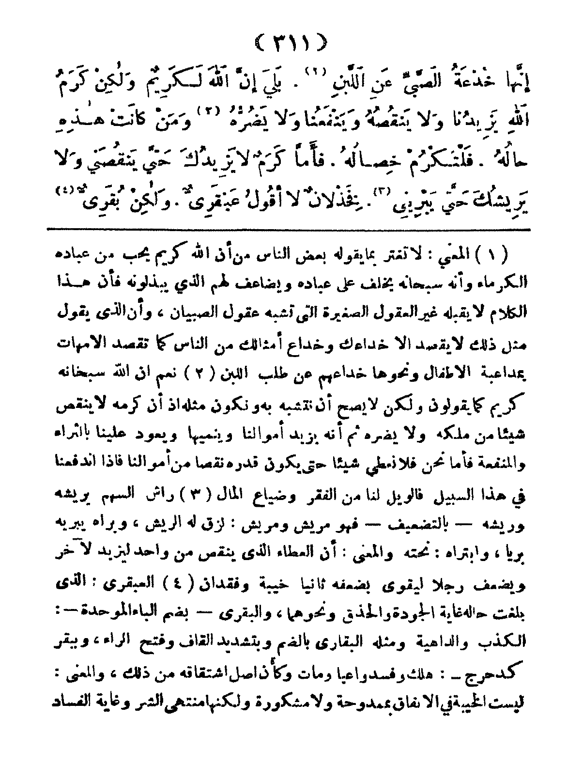 إِنَّهَا خُدْعَةُ الصَّبِّي عَنِ اللَّبَنِ، بَلَى إِنَّ اللهَ لَكَرِيمٌ، وَلَكِنَّ كَرَمَ اللهِ يَزِيدُنَا وَلا يَنْقُصُهُ، وَيَنْفَعُنَا وَلا يَضُرُّهُ، وَمَنْ كَانَتْ هذِهِ حَالُهُ، فَلْتَكْرُمُ خِصَالُهُ، فَأَمَّا كَرَم ٌلا يَزِيدُكَ حَتَّى يَنْقُصِني، وَلا يَرِيشُكَ حَتَّى يَبْرِيَنِي، فَخِذلاَنٌ لا أَقُولُ عَبْقَرِيُّ، وَلَكِنْ بُقَرِيُّ.