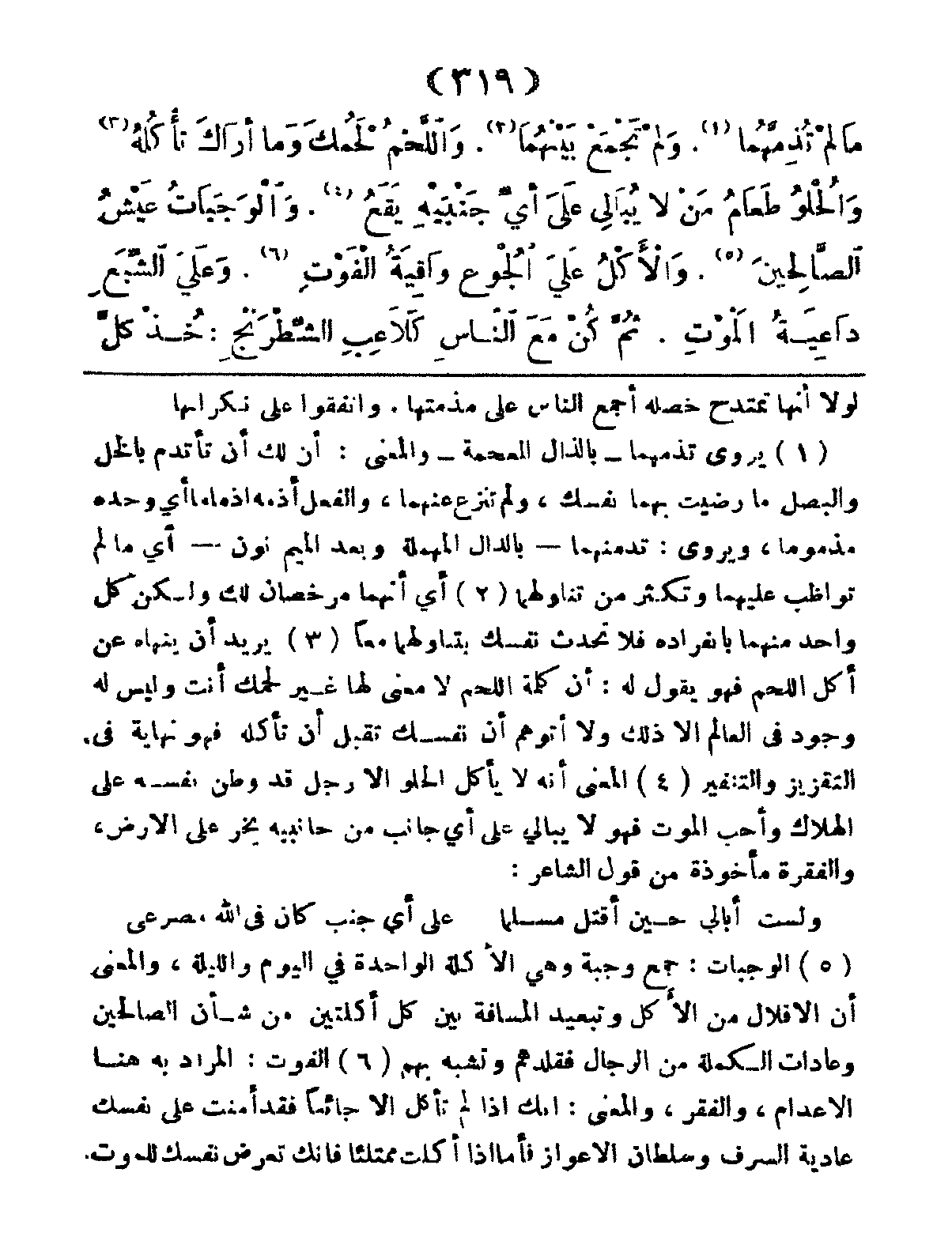 مَا لَمْ تُذِمَّهُمَا، وَلَمْ تَجْمَعْ بَيْنَهُمَا، وَاللَّحْمُ لَحْمُكَ وَمَا أَرَاكَ تَأْكُلُهُ، وَالحُلْوُ طَعَامُ مَنْ لا يُبَالي عَلى أَيِّ جَنْبَيْهِ يَقَعُ، وَالوَجَبَاتُ عَيْشُ الصَالِحِينَ، وَالأكْلُ على الجُوعِ وَاقِيَةَ الفَوْتِ، وَعَلى الشِبَعِ دَاعِيَةُ المَوْتِ، ثُمَّ كُنْ مَعَ النَّاسِ كَلاعِبِ الشِّطْرَنْجِ: خُذْ كُلَّ