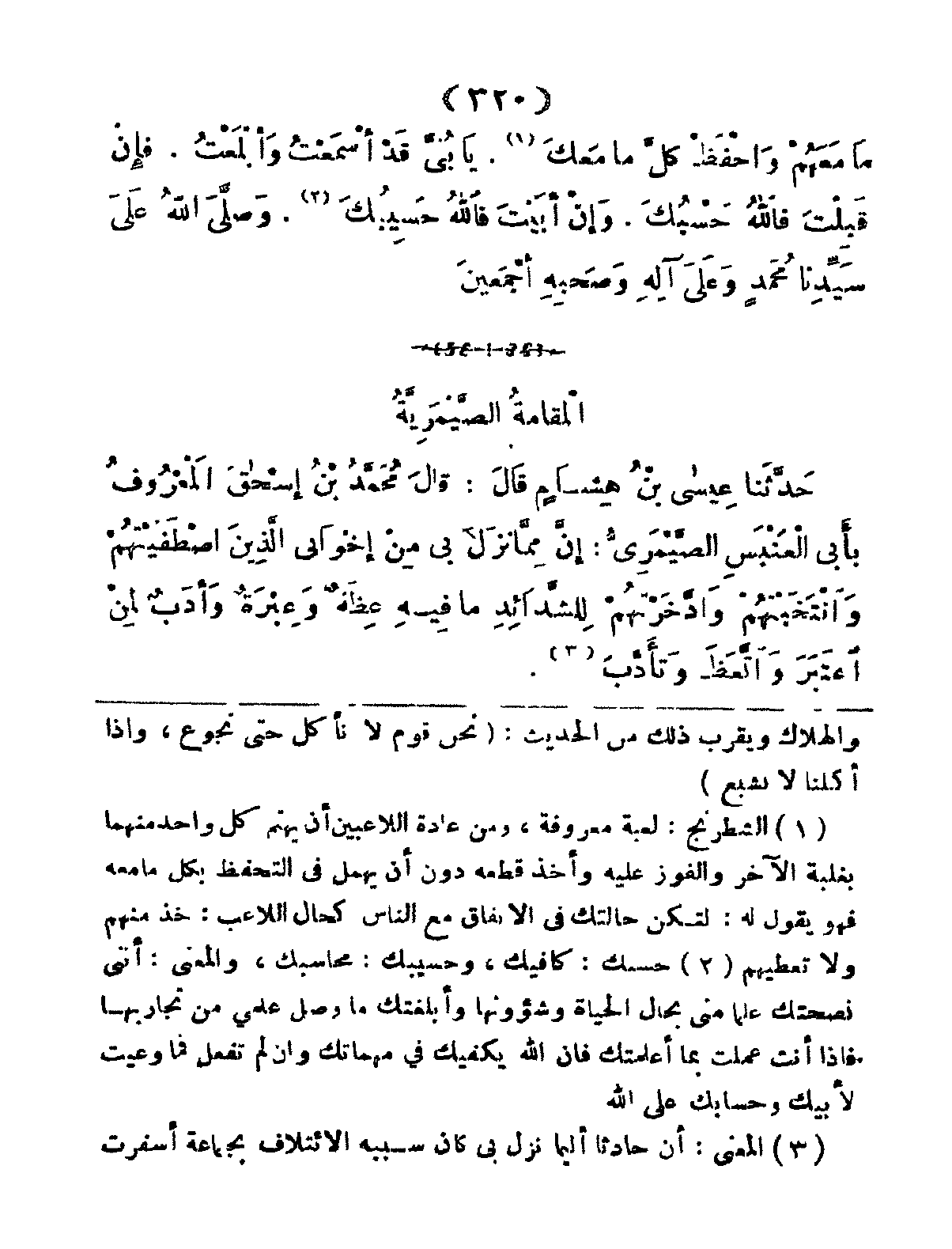 حَدَثَّنا عِيسى بْنُ هِشَامٍ قَالَ: قاَلَ مُحَمَّدُ بْنُ إِسْحَاقَ المَعْرُوفُ بِأَبِي العَنْبَسَ الصَّيْمَرِيُّ: إِنَّ مِمَّا نَزَلَ بِي مِنْ إِخْوانِي الَّذِينَ اصْطَفَيْتُهُمْ وَانْتَخَبْتُهُمْ وَادَّخَرْتُهُمْ لِلشَّدَائِدِ مَا فِيهِ عِظَةٌ وَعِبْرَةٌ وَأَدَبٌ لِمَنْ اعْتَبَرَ وَاتَّعَظَ وَتَأَدَبَ.