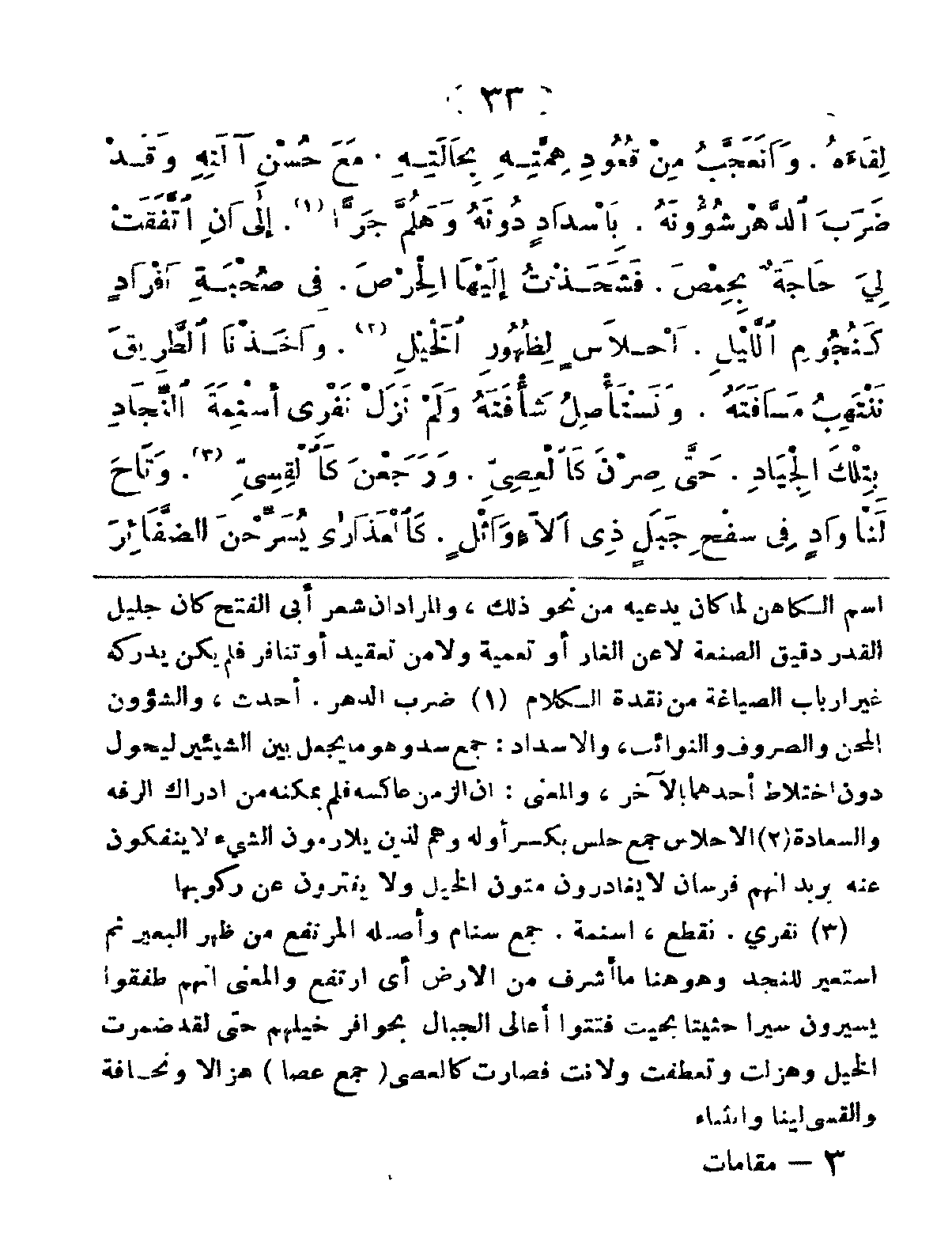لِقَاءَهُ، وَأَتَعَجَّبُ مِنْ قُعُودِ هِمَّتِهِ بِحَالَتِهِ، مَعَ حُسْنِ آلَتِهِ، وَقَدْ ضَرَبَ الدَّهْرُ شُؤُونَهَ، بِأَسِدَادِ دُونَهُ، وَهَلَّمَ جَرًّا، إِلَى أَنْ اتَّفَقَتْ لِيَ حَاجَةٌ بِحِمْصَ فَشَحَذْتُ إِليَهَا الحِرصَ، فِي صُحْبَةِ أَفْرِادٍ كَنُجُومِ اللَّيلِ، أَحْلاسٍ لِظُهُورِ الخَيلِ، وَأَخذْنَا الطَرِيقَ نَنْتَهِبُ مَسَافَتَهُ، وَنَسْتَأْصِلُ شأْفَتَهُ، وَلَمْ نَزَلْ نَفْرِي أَسْنِمَةَ النِّجَادِ بِتِلْكَ الْجِيَادِ، حَتَّى صِرْنَ كَالْعِصِيِّ، وَرَجَعْنَ كَالْقِسِيِّ، وَتَاخَ لَنَا وَادٍ فِي سَفْحِ جَبَلٍ ذِي أَلاءٍ وأَثْلٍ، كَالعَذَارَى يُسَّرِحْنَ الضَّفَائِرَ،