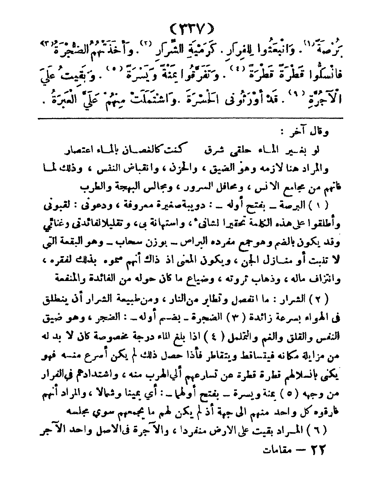 بَرْصَةً، وَاْنَبَعُثوا لِلْفِرَارِ كَرَمْيَةِ الشَّرَارِ، وأَخَذَتْهُمُ الضُّجْرَةُ، فَانْسَلُّوا قَطْرَةً قَطْرَةً، وَتَفَرَّقُوا يَمْنَةً وَيَسْرَةً، وَبَقِيتُ عَلى الآجُرَّةِ، قَدْ أَوْرَثُونِي الحَسْرَةَ، وَاشْتَمَلَتْ مِنْهُمْ عَلى العَبْرَةُ