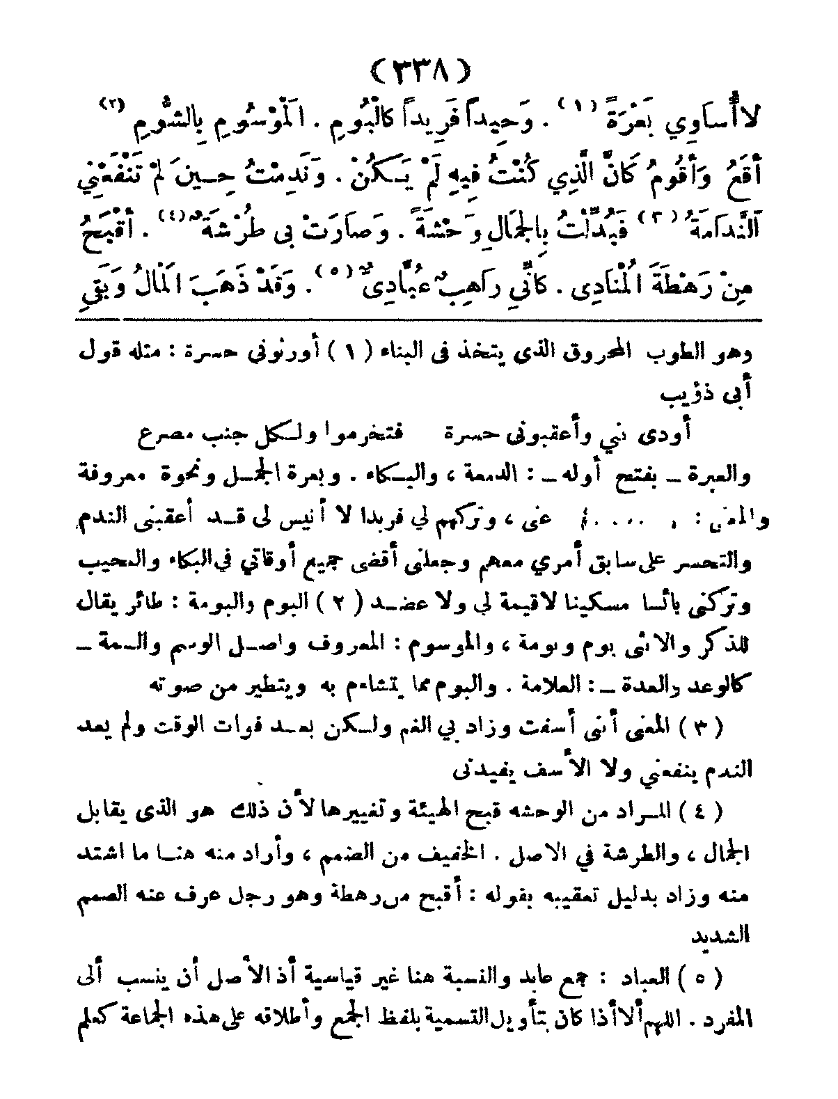 لا أُسَاوِي بَعْرَةً، وَحِيداً فَرِيداً كَالُبومِ، المَوسُومِ بَالشُّومِ، أَقَعُ وَأَقُومُ، كَأَنَّ الَّذِي كُنْتُ فِيهِ لَمْ يَكُنْ، وَنَدِمْتُ حِينَ لَمْ تَنْفَعْنِي النَّدَامَةُ، فَبُدِّلْتُ بِالجَمَالِ وَحْشَةً، وَصَارَتْ بِي طُرْشَةٌ، أَقْبَحُ مِنْ رَهْطَةَ المُنَادِى، كَأَنِّي رَاهِبٌ عِبَادِيٌّ، وَقَدْ ذَهَبَ المَالُ وَبَقِيَ