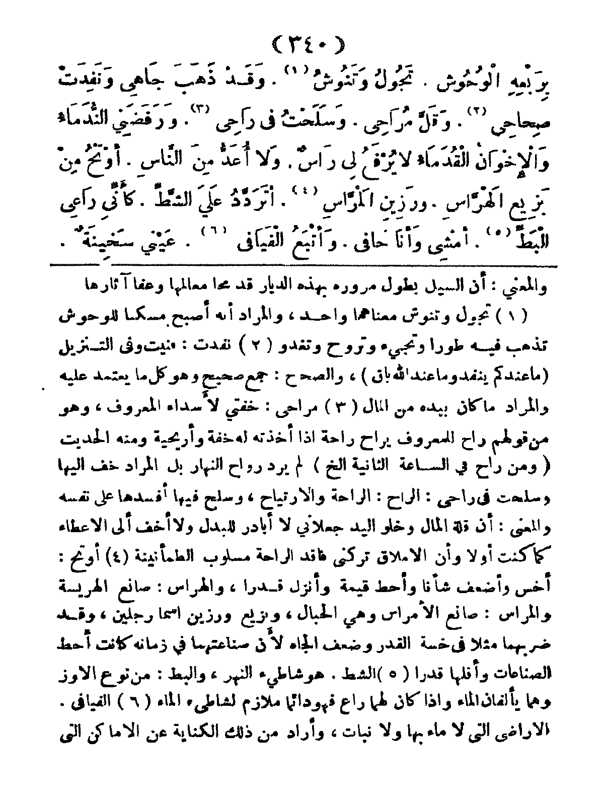 بِرَبْعِهِ الوُحُوش، تَجُولُ وَتَنُوشُ، وَقَدْ ذَهَبَ جَاهِي، وَنَفِدَتْ صِحاحِي، وَقَلَّ مَرَاحِي، وَسَلَحْتُ فِي رَاحِي، وَرَفَضَنِي النُّدَمَاءِ، وَالإِخَوَانُ القُدَمَاءُ، لا يُرْفَعُ لِي رَأْسٌ، وَلا أُعَدُّ مِنَ النَّاسِ، أَوْتَحُ مِنَ بَزِيع الهَرَّاسِ وَرَزِينٍ المَّراسِ، أَتَرَدَّدُ عَلى الشَّطِّ، كَأَنِّي رَاعِي البَطِّ، أَمْشِي وَأَنَا حَافي، وَأَتْبَعُ الفَيَافِي، عَيْنِي سَخِينَةٌ،