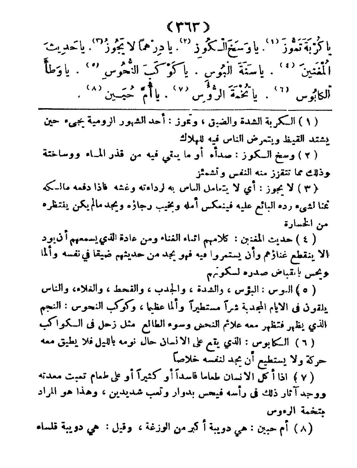يَا كُرْبَةَ تَمُّوزَ، يَا وَسَخَ الكُوزِ، يَا دِرْهَماً لا يَجُوزُ، يَا حَدِيثَ الْمَغِّنينَ، يَا سَنَةَ الْبُوسِ، يَا كَوْكَبَ النَّحُوسِ، يَا وَطَأَ الكابُوسِ، يَا تُخْمَةَ الرَّؤُسِ، يَا أُمَّ حُبَيْنِ،