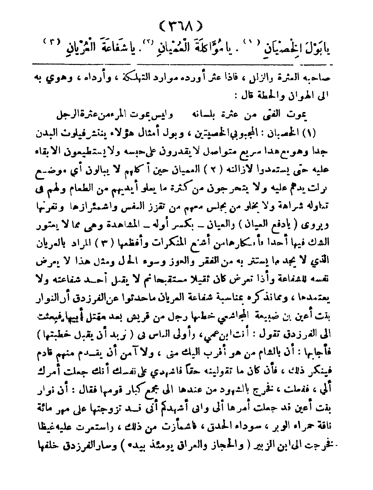 يَا بَوْلَ الخِصْيَانِ، يَا مُؤَاكَلَةَ العُمْيَانِ، يَا شَفَاعَةَ العُرْيَانش،