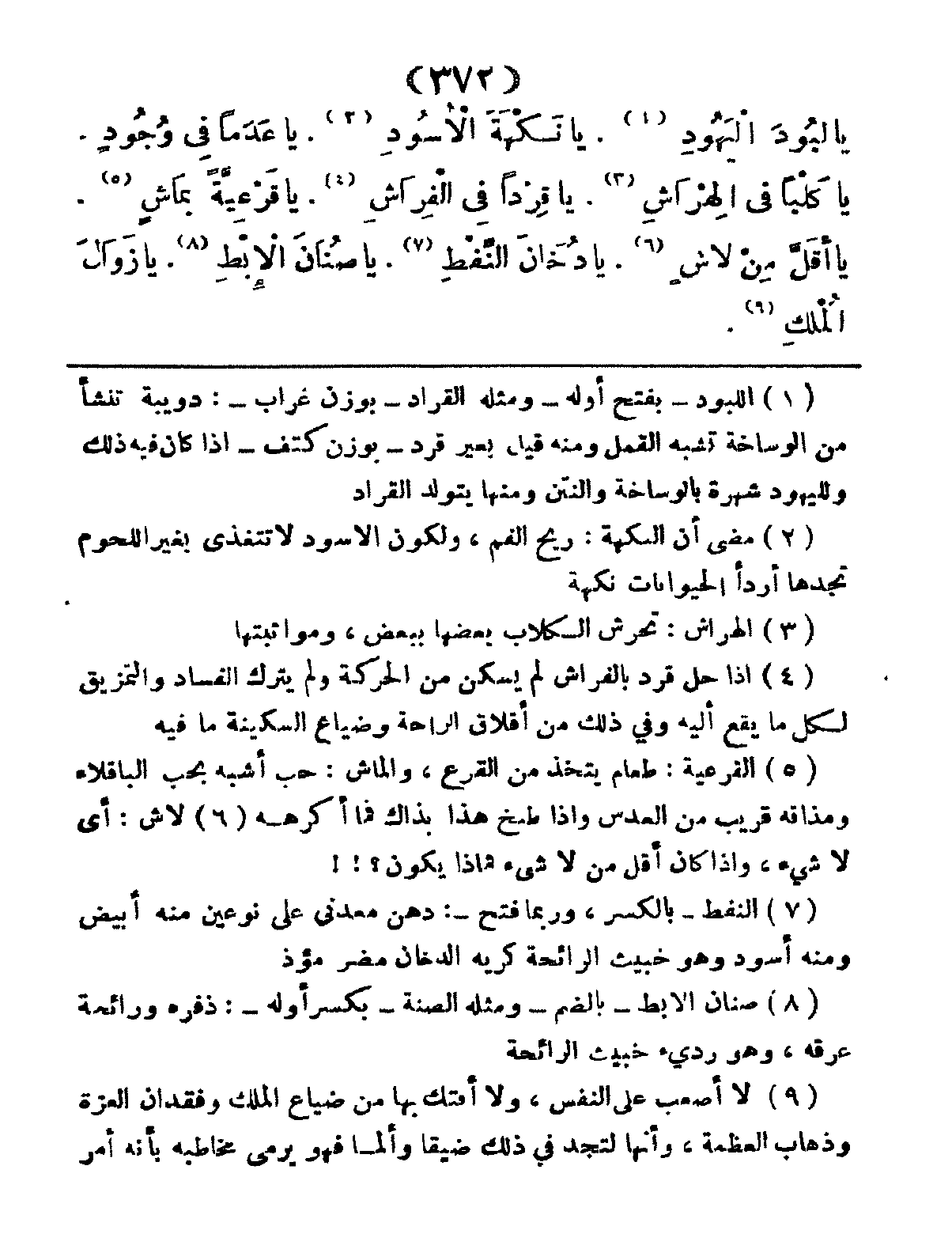 يَا لَبُودَ اليَهُودِ: يَا نَكْهَةَ الأُسُودِ، يَا عَدَماً فِي وُجُودٍ، يَا كَلْبَاً فِي الهِرَاشِ، يَا قِرْداً فِي الفِرَاشِ، يَا قَرءعِيَّةً بِمَاشٍ، يَا أَقَلَّ مِنْ لاشٍ، يَا دُخَانَ النِّفْطِ، يَا صُنَانَ الإِبْطِ، يَا زَوَالَ المُلْكِ،