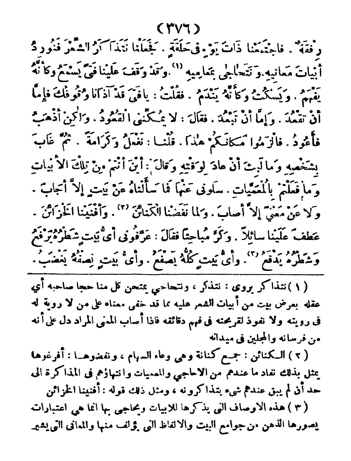 رُفْقَةٌ، فَاجْتَمَعْنا ذَاتَ يَوْم فِي حَلَقَةٍ، فَجَعَلْنا نَتَذَاكَرُ الشِّعْرَ فَنُورِدُ أَبْيَاتَ مَعَانِيِه، وَنَتَحاجى بِمَعَامِيهِ، وَقَدْ وَقَفَ عَليْنَا فَتَىً يَسْمَعُ وَكَأَنَّهُ يَفْهَمُ، وَيَسْكُت وَكَأَنَّهُ يَنْدَمُ، فَقُلْتُ: يَا فَتَى قَدْ آذَانَا وُقُوُفكَ؛ فَإِمَّا أَنْ تَقْعُدَ، وَإِمَّا أَنْ تَبْعُدَ، فَقالَ: لا يُمْكِنُنِي القُعُودُ، وَلَكِنْ أَذْهَبُ فَأَعُودُ، فَالزَمُوا مَكانَكُمْ هَذا، قُلْنَا: نَفْعَلُ وَكَرَامَةً، ثُمَّ غَابَ بِشَخْصِهِ، وَمَا لَبِثَ أَنْ عادَ لِوَقْتِهِ، وَقَالَ: أَيْنَ أَنْتُمْ مِنْ تِلْكَ الأَبْيَاتِ؟ وَمَا فَعَلْتُمْ بِالمُعَمَّياتِ؟ سَلُونِي عَنْهَا، فَمَا سَأَلْنَاهُ عَنْ بَيْتٍ إِلاَّ أَجَابَ، وَلا عَنْ مَعْنَىً إِلاَّ أَصَابَ، وَلَمَّا نَفَضْنَا الكَنَائِنَ، وَأَفْنَيْنَا الخَزَائِنَ، عَطَفَ عَلَيْنَا سائِلاً، وَكَرَّ مُبَاحِثاً، فَقَالَ: عَرِّفُوني أَيُّ بَيْتٍ شَطْرُهُ يَرْفَعُ وَشَطْرُهُ يَدْفَعُ؟ وَأَيُّ بَيْتٍ كُلُّهُ يَصْفَعُ؟ وَأَيُّ بَيْتٍ نِصُفُهُ يَغْضَبُ،