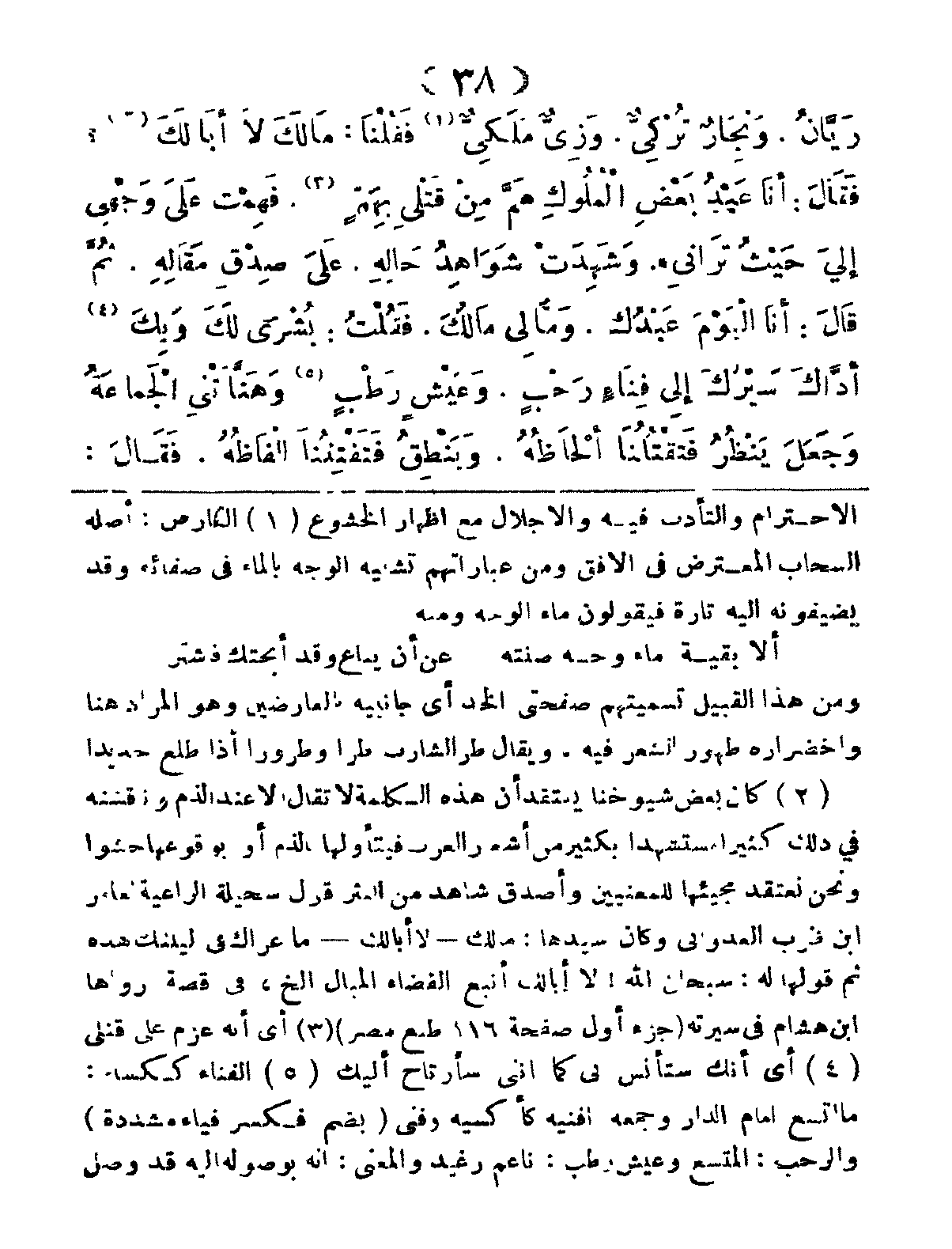 رَيَّانُ، ونِجَارٌ تُرْكِيٌ، وَزِيٌ مَلَكِيٌ، فَقُلْنَا: مَالَكَ لاَ أَبَالكَ؟ فَقَالَ: أَنَا عَبْدُ بَعْضِ الْمُلوكِ، هَمَّ مِنْ قَتْلي بِهَمٍّ، فَهِمْتُ عَلى وَجْهِي إِلى حَيْثُ تَرانِي، وَشَهِدَتْ شَوَاهِدُ حالهِ، على صِدْقِ مَقَالِهِ، ثُمَّ قَالَ: أَنَا اليَومَ عَبْدُكَ، وَمَالِي مَالُكَ، فَقُلْتُ: بُشْرَى لَكَ وَبِكَ، أَدَّاكَ سَيْرُكَ إِلَى فِنَاءٍ رَحْبٍ، وَعَيْشٍ رَطْبٍ، وَهَنْأَتْنِي الْجَمَاعَةُ، وَجَعَلَ ينْظُرُ فَتَقْتُلَنَا أَلْحَاظَهُ، وَيَنْطِقُ فَتَفْتِنٌنَا أَلْفَاظَهُ، فَقَالَ:
