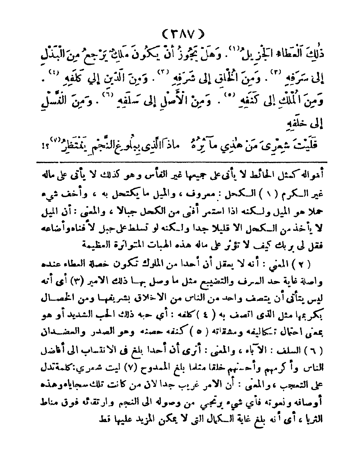 ذَلِكَ العَطَاءُ الجَزِيلُ؟ وَهَلْ يَجُوزُ أَنْ يَكُونَ مَلِكٌ يَرْجعُ مِنَ البَذْلِ إِلَى سَرَفِهِ، وَمِنَ الخُلْقِ إِلَى شَرَفِهِ، وَمِنَ الدّيْنِ إِلَى كَلَفِهِ وَمِنَ المُلْكِ إِلى كَنَفِهِ، وَمِنَ الأَصْلِ إِلى سَلَفِهِ، وَمِنَ النَّسْلِ إِلى خَلَفِهِ: