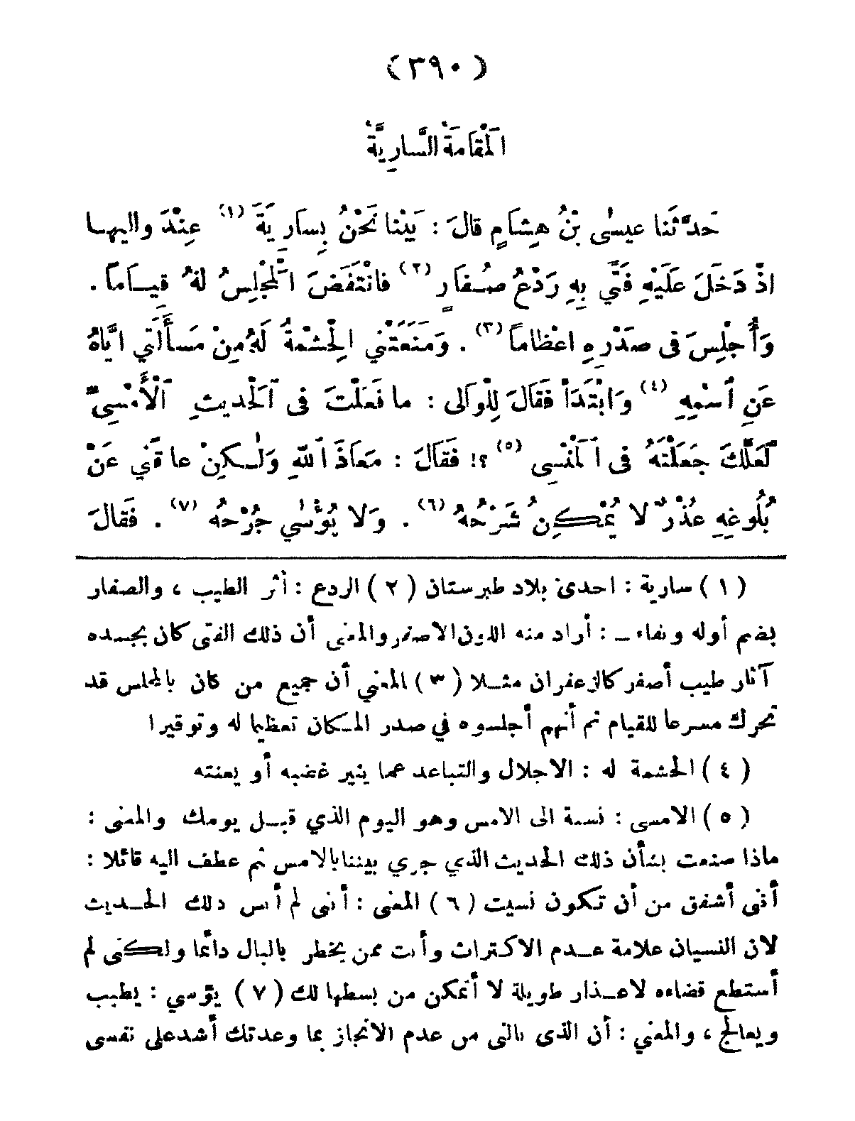 حَدَّثَنا عِيسَى بْنُ هِشَامٍ قَالَ: بَيْنَا نَحْنُ بِسَارِيَّةَ، عِنْدَ وَاليها، إِذْ دَخَلَ عَلَيْهِ فَتَىً بِهِ رَدْعُ صُفَارٍ، فَانْتَفَضَ المَجْلِسُ لَهُ قِيَاماً، وَأُجْلِسَ فِي صَدْرِهِ إِعْظَاماً، وَمَنَعَتْنِي الحِشْمَةُ لَهُ مِنْ مَسْأَلَتِي إِيَّاهُ عَنْ اسْمِهِ، وَابْتَدأَ فَقَالَ لِلْوالي: مَا فَعَلْتَ فِي الحَدِيثِ الأَمْسِي، لَعَلَّكَ جَعَلْتَهُ في المَنْسِي؟! فَقَالَ: مَعَاذَ اللهُ، وَلَكِنْ عَاقَنِي عَنْ بُلُوغِهِ عُذْرٌ لا يُمْكِنُ شَرْحُهُ، وَلا يُؤْسى جُرْحُهُ، فَقَالَ