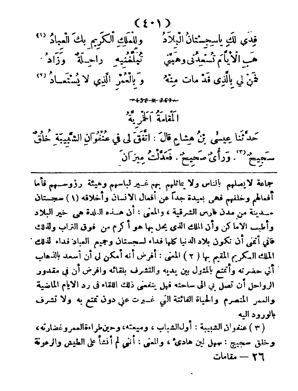 فِدَىً لَكِ يَا سِجِسْتَانُ البِلاَدُ ... وَلِلْمَلِكِ الكَرِيمِ بِكِ العِبَادُ