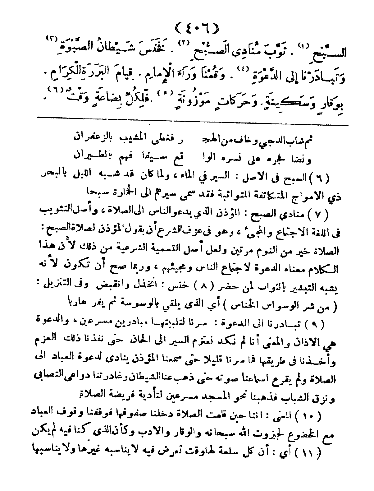السَّبْحِ، ثَوَّبَ مُنَادِي الصُّبْحِ، فَخَنَسَ شَيْطَانُ الصَّبْوَةِ، وَتَبَادَرْنَا إِلَى الدَّعْوَةِ، وَقُمْنَا وَرَاءَ الإِمَامِ، قِيَامِ البَرَرَةِ الكِرَامِ، بِوَقَارٍ وَسَكِينَةٍ، وَحَرَكَاتٍ مَوْزُونَةٍ، فَلِكُلِّ بِضَاعَةٍ وَقْتٌ،