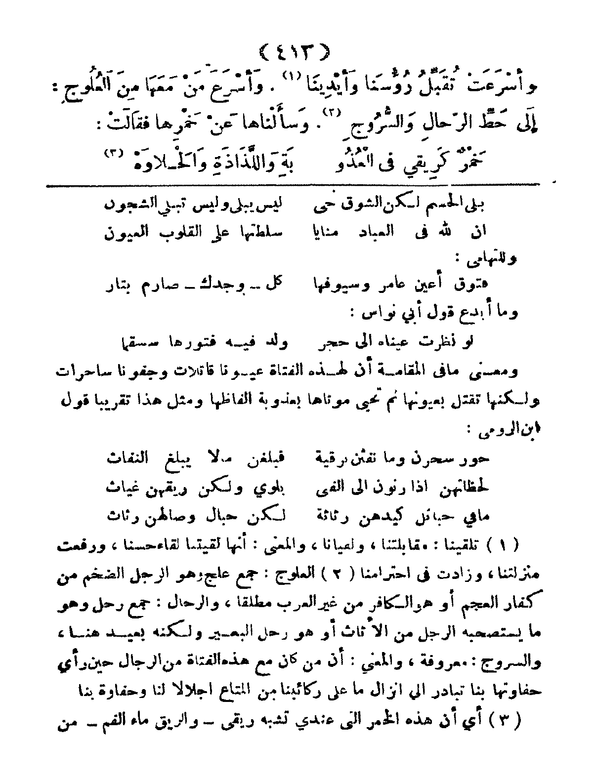 وَأَسْرَعَتْ تُقَبِّلُ رُؤُوسَنَا وَأَيْدِينَا، وَأَسْرَعَ مَنْ مَعَهَا مِنَ العُلُوجِ، إِلَى حَطِّ الرِّحَالِ وَالسُّرُوجِ، وَسَأَلْنَاهَا عَنْ خَمْرِهَا، فَقَالَتْ: