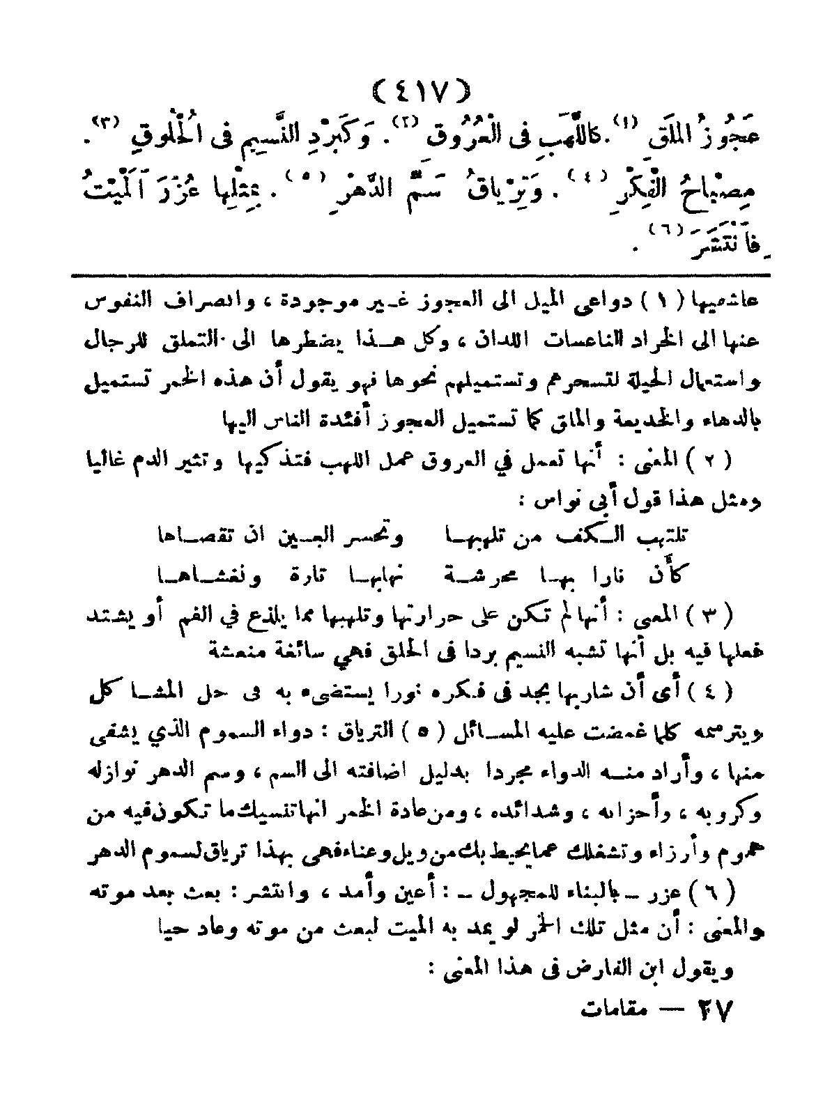 عَجُوزُ المَلْقِ، كَالَّلهَبِ في العُرُوقِ، وَكَبَرْدِ النَّسِيم فِي الحُلُوقِ، مِصْبَاحُ الفِكْرِ، وَتِرْيَاقُ سَمِّ الدَّهْرِ، بِمِثْلِهَا عُزّزَ المَيِّتُ فَانْتَشَرَ،