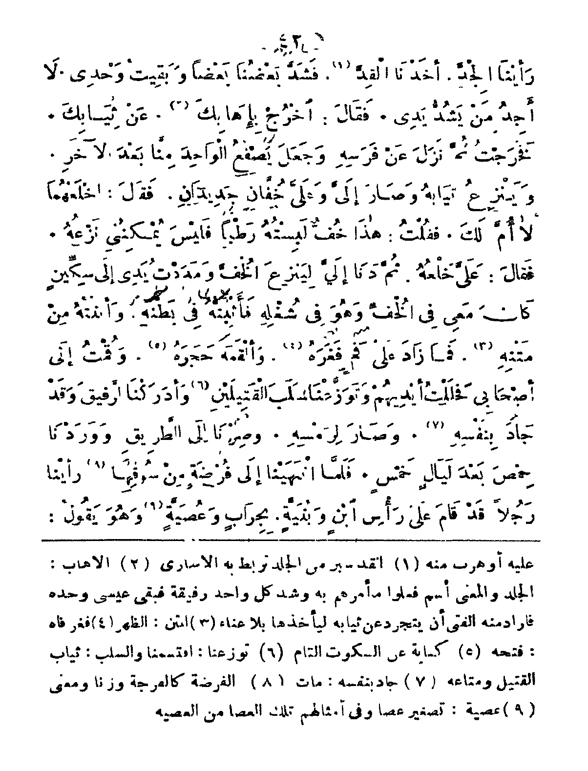 خَلْعُهُ، ثُمَّ دَنَا إِلَيَّ لِيَنْزَعَ الخُفَّ، وَمَدَدْتُ يَدْي إِلَى سِكْينٍ كَانَ مَعْي فِي الخُفِّ وَهْوَ فِي شُغْلِهِ فَأَثْبَتَّهُ فِي بَطْنِهِ، وَأَبَنْتَهُ مِنْ َمَتْنهِ، فَمَا زَادَ عَلى فَمٍ فَغَرَهُ، وأَلَقَمَهُ حَجَرَهُ، وَقُمْتُ إِلى أَصْحَابِي فَخَلَلْتُ أَيْدِيِهِمْ، وَتَوَزْعَنَا سَلَبَ القَتِيلَينِ، وأَدَرَكْنَا الرَّفِيقَ وَقَدْ جَادَ بِنَفْسِهِ، وِصِارَ لِرَمْسِهِ، وَصِرْنَا إِلى الطَّرِيقِ، وَوَرَدْنا حِمْصَ بَعْدَ لَيَالٍ خَمْسٍ، فَلَمَّا انْتَهَيْنَا إِلى فُرْضَةِ مِنْ سُوقِهَا رَأَيْنَا رَجُلاً قَدْ قَامَ عَلى رأَسِ ابْنٍ وَبُنَيةٍ، بِجِرابٍ وَعَصِيةٍ، وهُوَ يَقُولُ: عُهُ، ثُمَّ دَنَا إِلَيَّ لِيَنْزَعَ الخُفَّ، وَمَدَدْتُ يَدْي إِلَى سِكْينٍ كَانَ مَعْي فِي الخُفِّ وَهْوَ فِي شُغْلِهِ فَأَثْبَتَّهُ فِي بَطْنِهِ، وَأَبَنْتَهُ مِنْ َمَتْنهِ، فَمَا زَادَ عَلى فَمٍ فَغَرَهُ، وأَلَقَمَهُ حَجَرَهُ، وَقُمْتُ إِلى أَصْحَابِي فَخَلَلْتُ أَيْدِيِهِمْ، وَتَوَزْعَنَا سَلَبَ القَتِيلَينِ، وأَدَرَكْنَا الرَّفِيقَ وَقَدْ جَادَ بِنَفْسِهِ، وِصِارَ لِرَمْسِهِ، وَصِرْنَا إِلى الطَّرِيقِ، وَوَرَدْنا حِمْصَ بَعْدَ لَيَالٍ خَمْسٍ، فَلَمَّا انْتَهَيْنَا إِلى فُرْضَةِ مِنْ سُوقِهَا رَأَيْنَا رَجُلاً قَدْ قَامَ عَلى رأَسِ ابْنٍ وَبُنَيةٍ، بِجِرابٍ وَعَصِيةٍ، وهُوَ يَقُولُ: