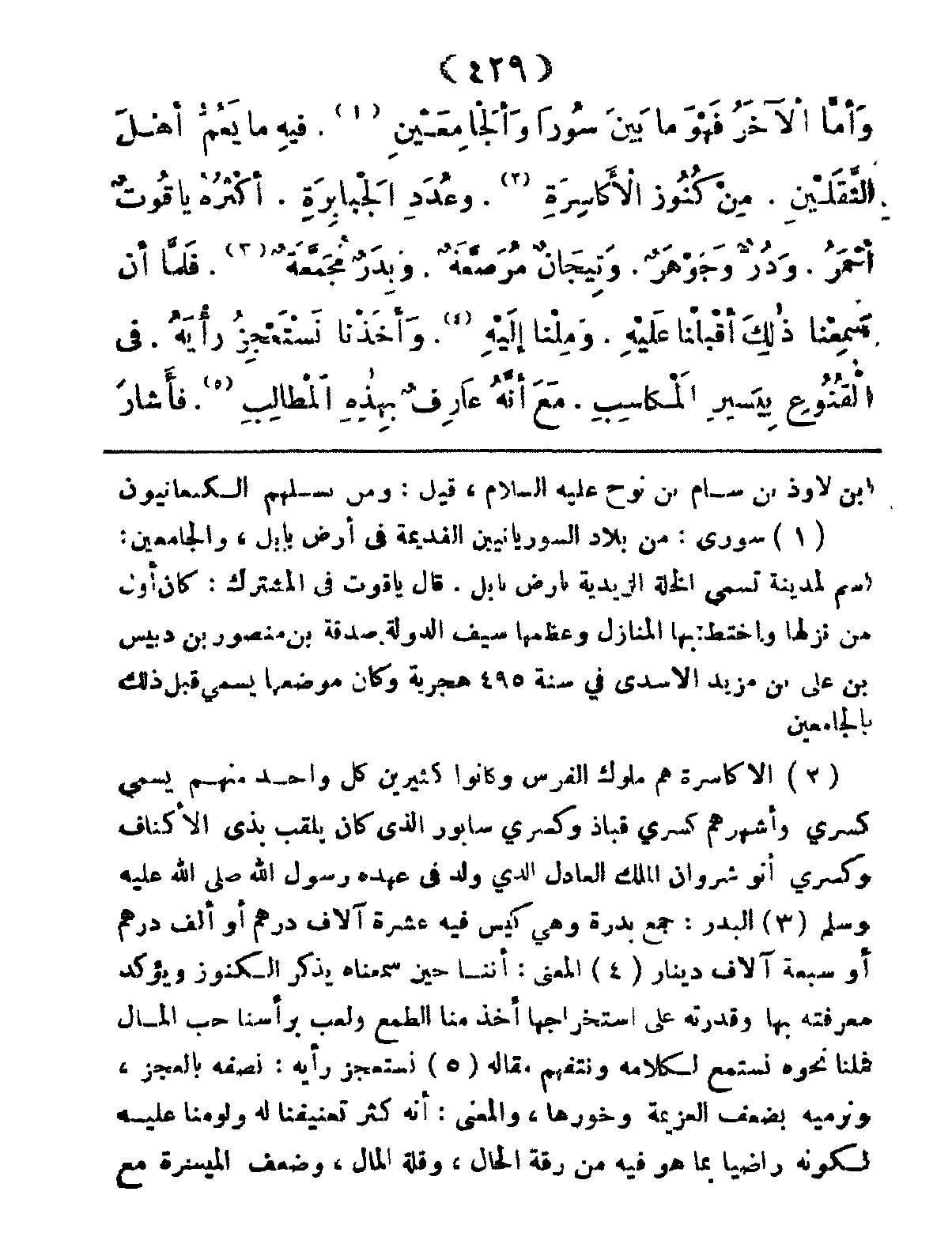 وَأَمَّا الآخَرُ فَهْوَ مَا بَينَ سُورَا وَالجَامِعَيْنِ، فِيهِ مَا يَعُمُّ أَهْلَ الثَّقَلْينِ، مِنْ كُنُوزِ الأَكَاسِرَةِ، وَعُدَدِ الجَبَابِرَةِ، أَكْثَرُهُ يَاقُوتٌ أَحْمَرُ، وَدُرُّ وَجَوْهَرٌ وَتِيجَانٌ مُرَصَّعَةٌ وَبِدَرٌ مُجَمَّعَةٌ فَلَمَّا أَنْ سَمِعْنَا ذَلِكَ أَقْبَلْنَا عَلَيْهِ وَمِلْنَا إِلَيْهِ، وَأَخَذْنَا نَسْتَعْجِز رَأَيَهُ، فِي القُنُوعِ بِيَسِيرِ المَكَاسِبِ، مَعَ أَنَّهُ عَارِفٌ بِهَذِهِ المَطَالِبِ، فَأَشَارَ