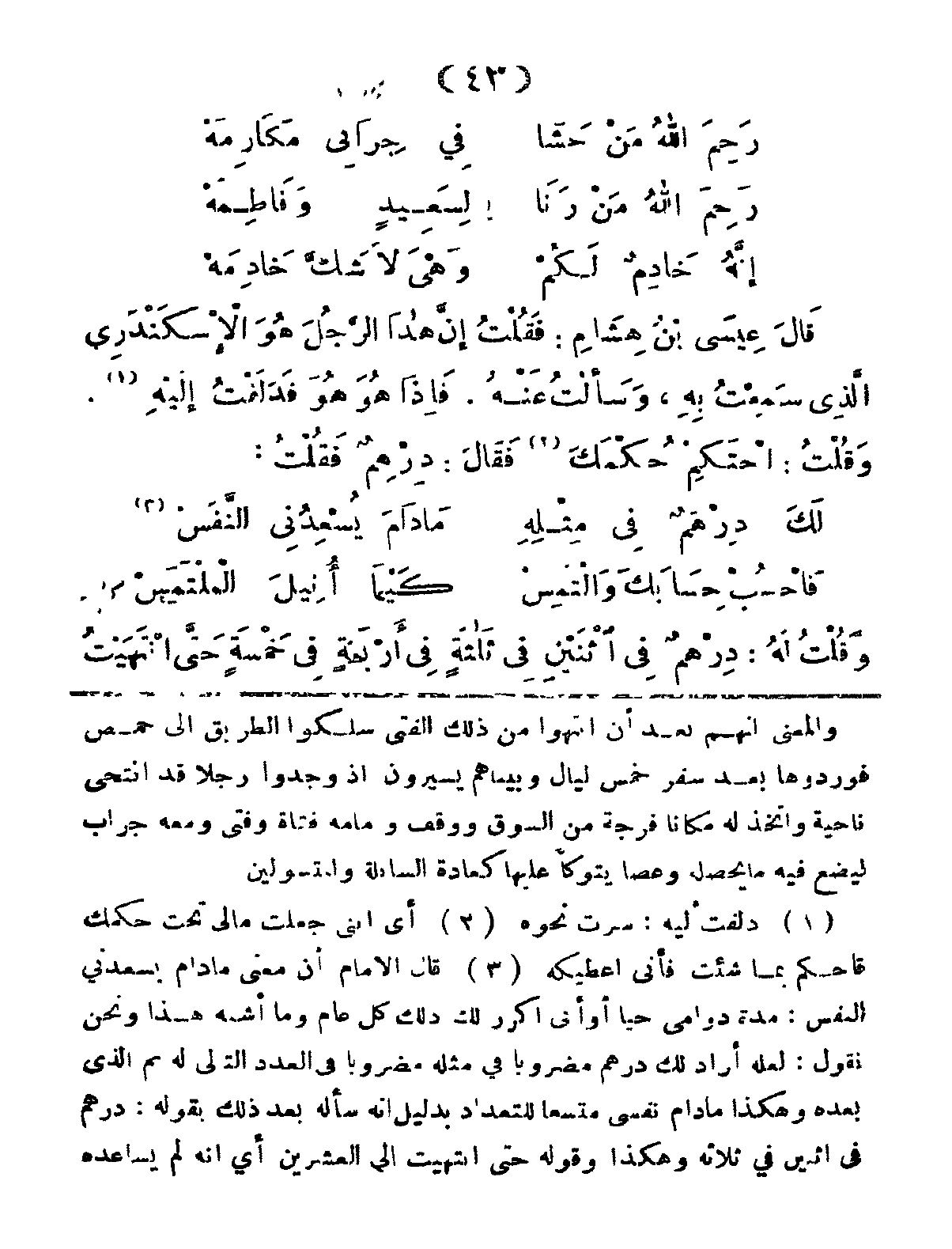 قَالَ عِيسَى بْنُ هِشَامٍ: فَقُلْتُ إِنَّ هَذا الرَّجُلَ هُوَ الإِسْكَنْدَرِيُّ الَّذي سَمِعْتُ بِهِ، وَسَأَلْتُ عَنْهُ، فَإِذَا هُوَ هُوَ، فَدَلَفْتُ إَلَيهِ، وَقُلْتُ: احْتَكِمْ حُكْمَكَ فَقَالَ: دِرْهَمٌ، فَقُلْتُ: