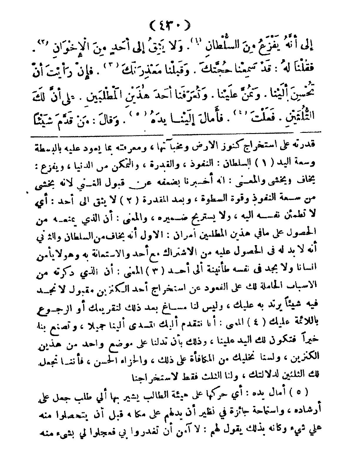 إِلَى أَنَّهُ يَفْزَعُ مِنْ السُّلْطانِ، وَلا يَثِقُ إِلى أَحَدٍ مِنَ الإِخْوَانِ، فَقُلْنَا لَهُ: قَدْ سَمِعْنَا حُجَّتُكَ، وَقَبِلْنَا مَعْذِرَتَكَ، فَإِنْ رَأَيْتَ أَنْ تُحْسِنَ إِلَيْنَا، وَتَمُنَّ عَلَيْنَا، وَتُعَرَّفْنَا أَحَدَ هَذَيْنِ المَطْلَبَيْنِ، عَلى أَنَّ لَكَ الثُّلُثَيْنِ؛ فَعَلْتَ، فَأمالَ إِلَيْنَا يَدَهُ، وَقَالَ: مَنْ قَدَّمَ شَيْئاً