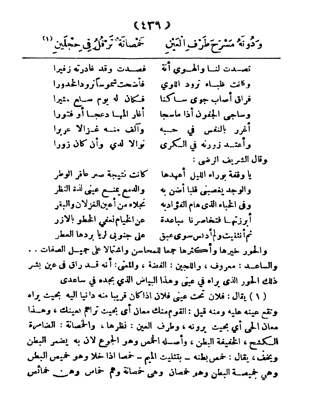 وَدُونَهُ مَسْرحَ طَرْفِ العَيْنِ ... خَمْصَانَةٌ تَرْفُلُ فَي حِجْلَينِ