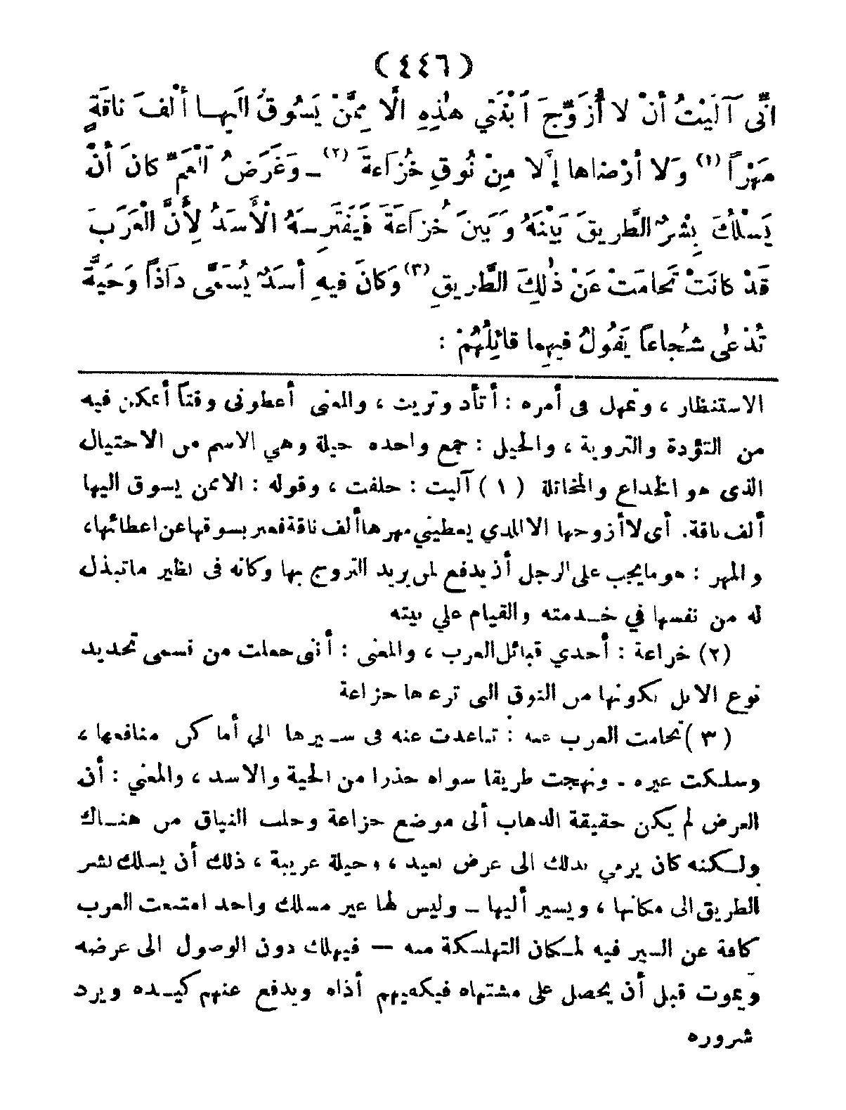 إِنِّي آلَيْتُ أَنْ لاَ أُزَوِّجَ ابْنَتِي هَذِهِ إِلاَّ مِمَّنْ يَسُوقُ إِلَيْهَا أَلْفَ نَاقَةٍ مَهْراً، وَلا أَرْضَاهَا إِلاَّ مِنْ نُوقِ خُزَاعَةَ، وَغَرَضُ العَمِّ كَانَ أَنْ يَسْلُكَ بِشْرٌ الطَّرِيقَ بَيْنَهُ وَبَيْنَ خُزَاعَةَ فَيَفْتَرِسَهُ الأَسَدُ؛ لأَنَّ العَرَبَ قَدْ كَانَتْ تَحَامَتْ عَنْ ذَلكَ الطَّريقِ، وَكَانَ فِيهِ أَسَدٌ يُسَمَّى دَاذاً، وَحَيَّةٌ تُدْعَى شُجَاعاً، يَقُولُ فِيِهِمَا قَائِلهُمْ: