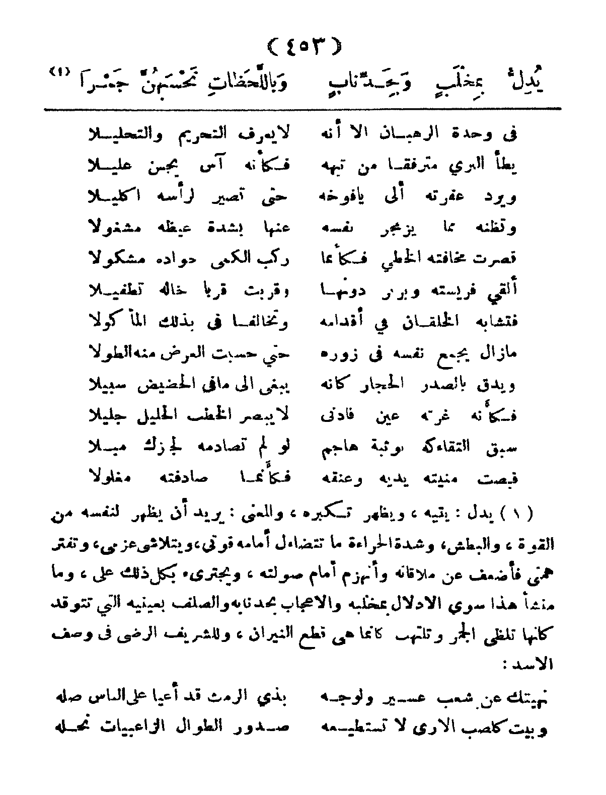 يُدِلُّ بِمِخْلَبٍ وَبِحَدِّ نَابٍ ... وَبِاللَّحَظاتِ تَحْسَبُهُنَّ جَمْرَا