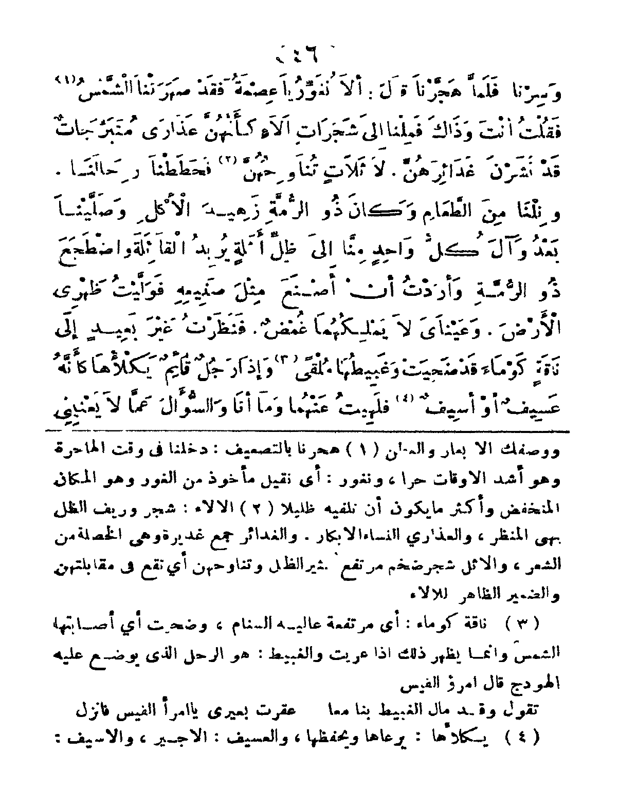 وَسِرْنَا فَلَمَّا هَجَّرْنا قَالَ: أَلاَ نُغَوِّرُ يَاعِصْمةُ فَقَدْ صَهَرَتْنَا الْشَّمْسُ؟ فَقُلْتُ: أَنْتَ وَذَاكَ، فَمِلْنَا إِلِى شَجراتٍ أَلاَءٍ كَأَنْهُنَّ عَذارَى مُتَبَرِّجاتٌ، قَد نَشَرْنَ غَدائِرَهُنَّ، ِلأثَلاثٍ تُنَاوِحُهُنَّ، فَحَطَطْنَا رِحَالَنَا، وَنِلْنَا مِنَ الطَّعَامِ، وَكانَ ذُو الرُّمَةِ زَهِيدَ الأَكلِ، وَصَلَّيْنَا بَعْدُ، وَآلَ كُلُّ وَاحِدٍ مِنَّا إِلى ظِلِّ أَثَلةٍ يُرِيدُ الْقَائِلَةَ، وَاضَطَجَعَ ذُو الرُّمَّةِ، وَأَرَدْتُ أَنْ أَصْنَعَ مِثَلَ صَنِيعِهِ، فَوَلَّيْتُ ظَهْرِي الأَرْضَ، وَعَيْنَاي لاَ يَمْلِكُهُمَا غُمْضٌ، فَنَظَرْتُ غَيْرَ بَعِيدٍ إِلَى نَاقَةٍ كَوْمَاءَ قَدْ ضَحِيَتْ وَغَبِيطُهَا مُلْقىً، وَإِذَا رَجُلٌ قَائِمٌ يَكْلأُهَا كأَنَّهُ عَسِيفٌ أَوْ أَسِيفٌ فَلَهِيتُ عَنْهُمَا، وَما أَنَا وَالسُّؤالَ عَمَّا لاَ يَعْنِينِي؟