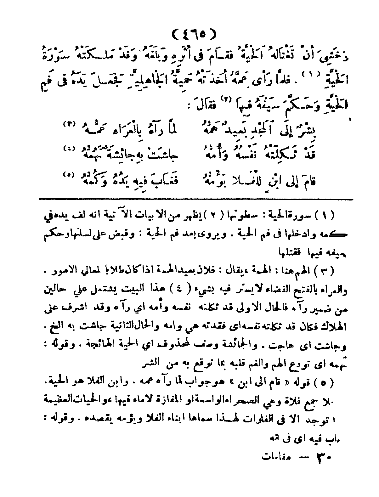 وَخَشِيَ أَنْ تَغْتَالَهُ الحَيَّةُ، فَقَامَ في أَثرِهِ، وَبَلَغَهُ وَقَدْ مَلكَتَهُ سَوْرَةُ الحَيَّةِ، فَلمَّا رَأَى عَمَّهُ أَخَذَتْهُ حَمِيَّةُ الجَاهِلِيَّةِ، فَجَعلَ يَدَهُ فِي فَمِ الحَيَّةِ وَحَكَّمَ سَيْفَهُ فِيهَا، فَقَالَ:
