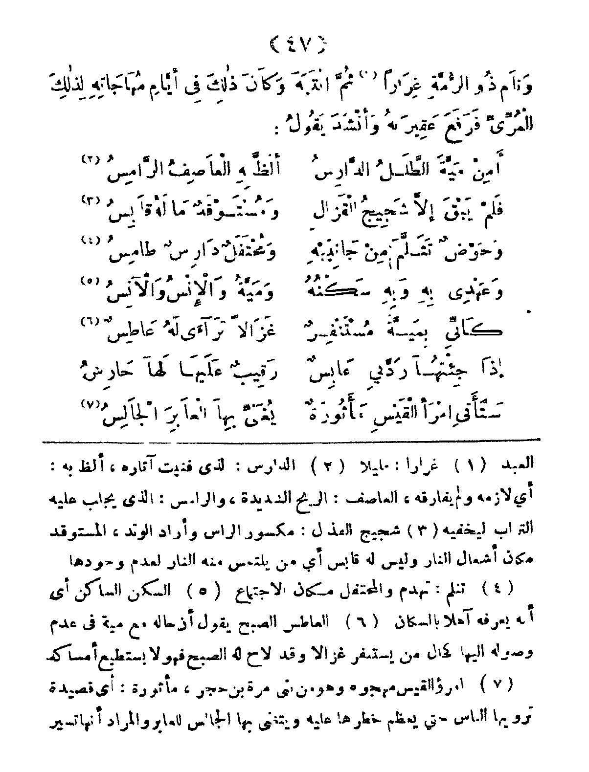 وَنَام ذُو الرُّمَّةِ غِرَاراً، ثُمَّ انْتَبَهَ، َوكاَنَ ذلِكَ فِي أَيَّامِ مُهَاجاتِهِ لِذَلكَ الْمُرِّيَّ، فَرَفَعَ عَقِيرَتَهُ وَأَنْشَدَ يَقُولُ: