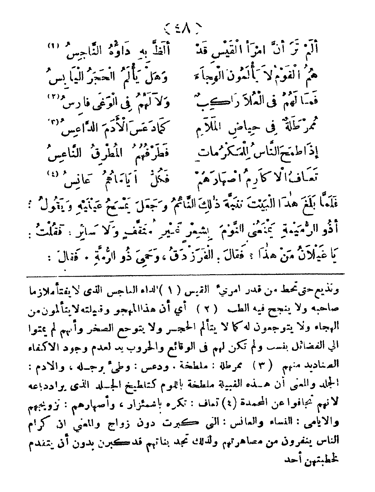 فَلَمَّا بَلَغَ هَذا البَيْتَ تَنَبَّهَ ذَلِكَ النَّائِمُ، وَجَعَلَ يَمْسَحُ عَيْنَيْهِ، وَيَقُولُ: أَذُو الرُّمَيْمَةِ يَمْنَعُنِي النَّوْمَ بِشِعْر غيْرِ مُثَقّفٍ وَلاَ سَائِر؟ فَقُلْتُ يَا غَيْلاَنُ، مَنْ هَذا؟ فَقَالَ: الْفَرَزْدَقُ، وَحَمِى ذُو الرُّمَّةِ فَقَالَ: