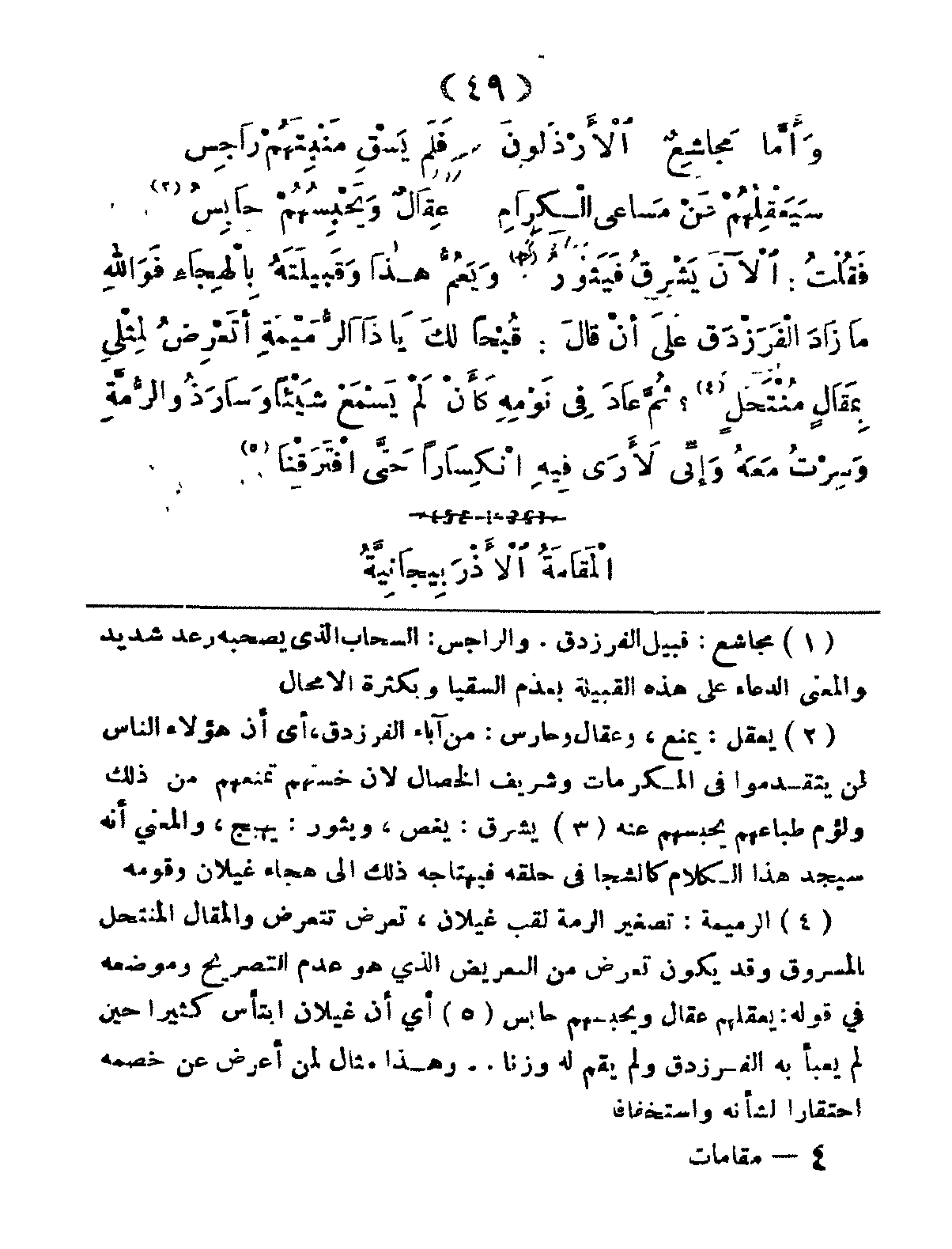 فَقُلْتُ: الآنَ يَشْرَقُ فَيَثُورُ، وَيَعُمُّ هذا وَقبِيلَتُهُ بِالهِجَاءِ، فَوَاللهِ مَا زَادَ الفَرَزْدَقُ عَلى أَنْ قَالَ: قُبْحَاً لكَ يا ذَا الرُّمَيْمَةِ! أَتَعْرِضُ لِمِثْلي بِمَقالٍ مُنْتَحَلٍ؟ ثُمَّ عَادَ فِي نَوْمِهِ كَأَنْ لَمْ يَسْمَعْ شَيْئاً، وَسَارَ ذُو الرُّمَّةِ وَسِرْتُ مَعَهُ، وَإِنِّي لأَرَى فِيهِ انْكِسَاراً حَتَّى افْتَرَقْنَا.