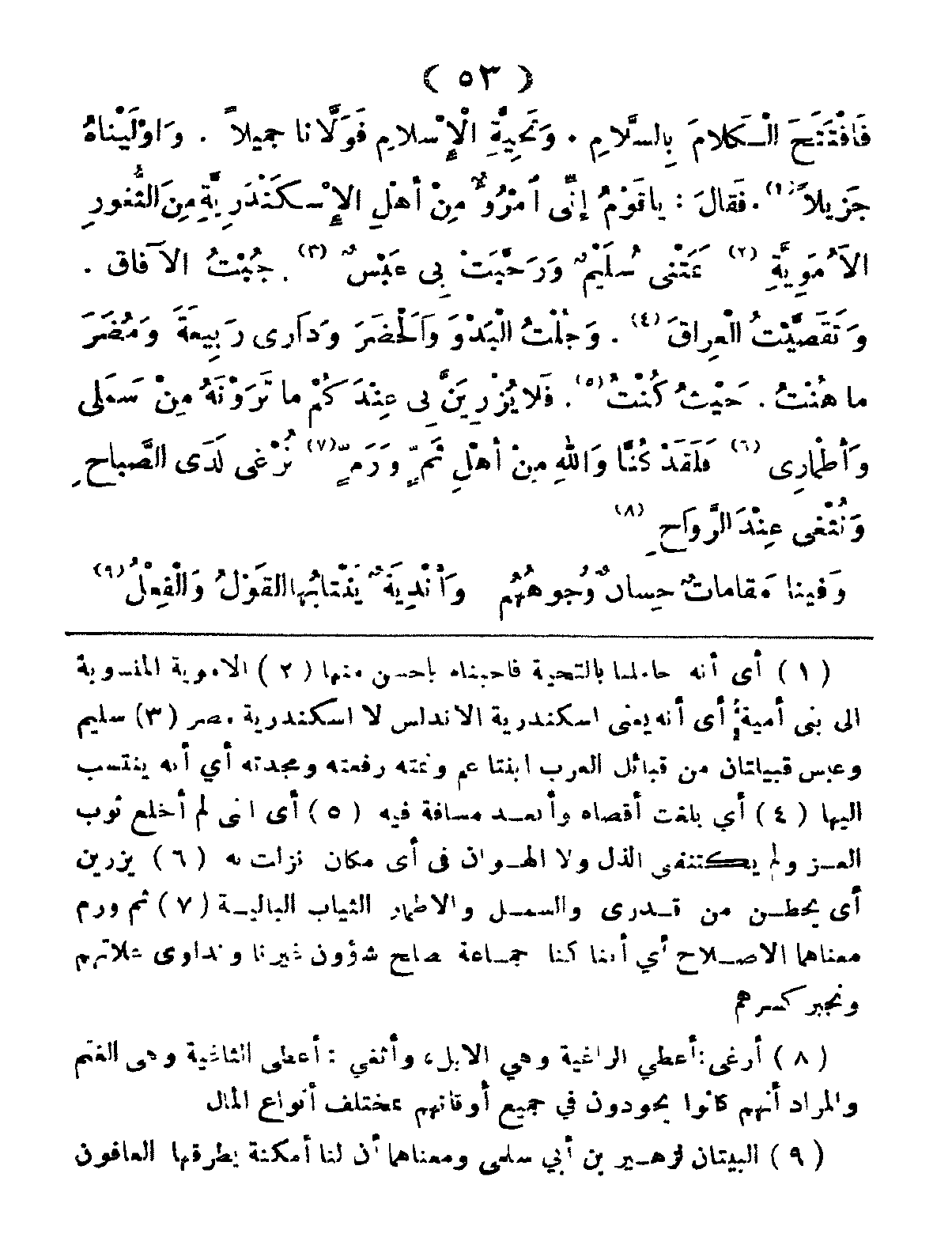 فافْتَتَحَ الْكَلامَ بِالسَّلامِ، وَتَحِيَّةِ الإِسْلامِ، فَوَلاَّنا جميلاً، وأَوْلَيْناهُ جَزيلاً، فَقَالَ: يا قَوْمُ إِنِّي امْرؤٌ مِنْ أَهْلِ الإِسْكَنْدَرِيَّةِ، مِنَ الثُغُورِ الأَمَويَّةِ نَمَتْني سُلَيْمٌ ورَحَّبَتْ بِي عَبْسٌ جُبْتُ الآفاق، وتَقَصَّيْتُ العِرَاقَ، وَجُلْتُ الْبَدْوَ وَالْحَضَرَ، ودَارَيْ رَبِيَعَةَ وَمُضَرَ، ما هُنْتُ، حَيْثُ كُنْتُ، فَلا يُزْرِيَنَّ بِي عِنْدكُمْ ما تَرَوْنَهُ مِن سَمَلي وأَطْماري، فَلَقَدْ كُنَّا وَاللهِ مِنْ أَهْلِ ثَمٍّ وَرَمٍّ، نُرْغِي لَدَى الصَّباحِ ونُثْغِى عِنًدَ الرَّواحِ
