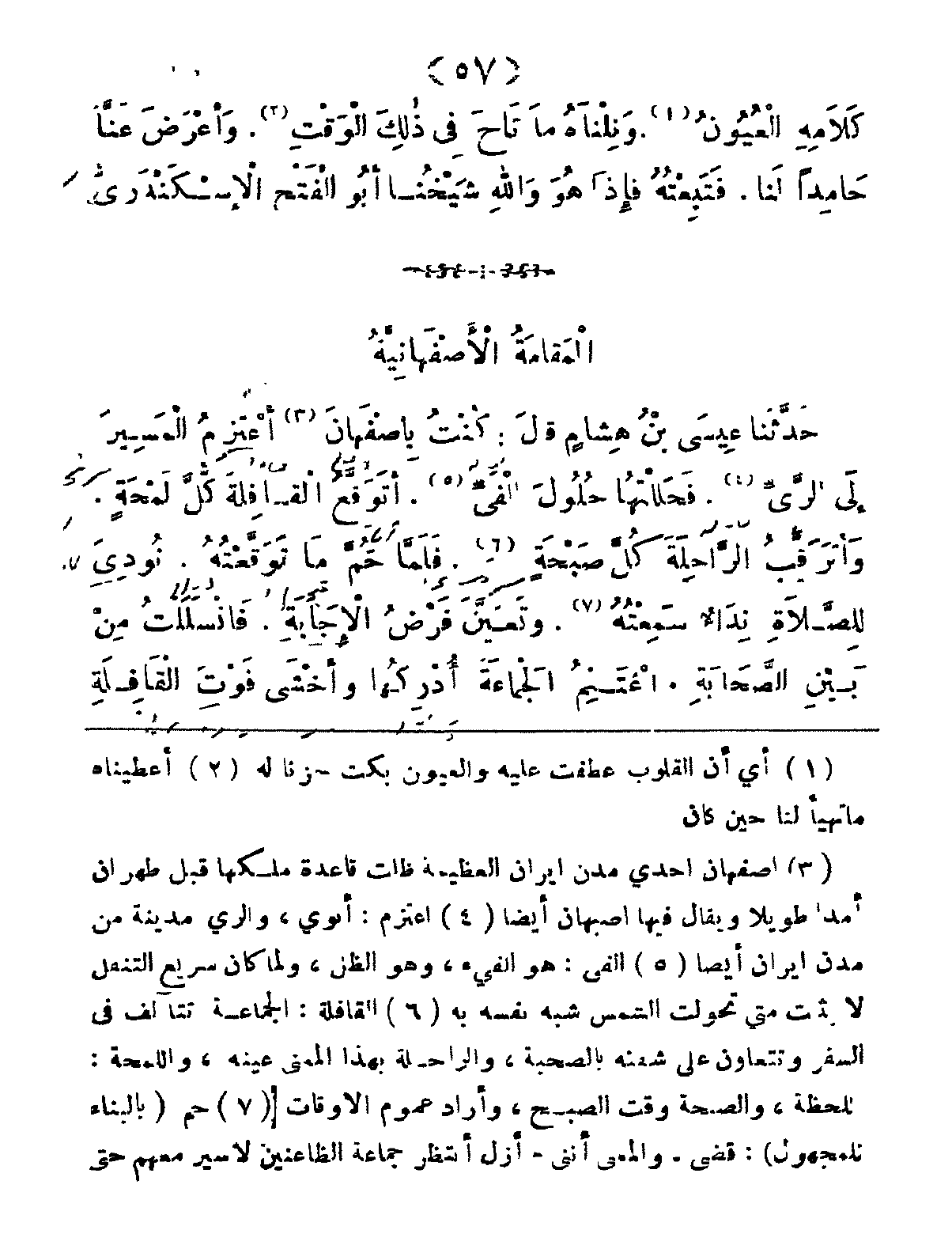 كُنْتُ بِأَصْفَهَانَ، أَعْتَزِمُ المَسِيرَ إِلى الرَّيِّ، فَحَلَلْتُهَا حُلُولَ أَلْفَيِّ، أَتَوَقَّعُ الْقَافِلةَ كُلَّ َلْمَحةٍ، وَأَتَرَقَّبُ الرَّاحِلَةَ كلَّ صّبْحَةٍ، فَلَمَّا حُمَّ مَا تَوَقَّعْتُهُ نُودِيَ لِلصَّلاةِ نِدَاءً سَمِعْتُهُ، وتَعَيَّنَ فَرْصُ الإِجَابَةِ، فَانْسَلَلْتُ مِنْ بَيْنِ الصَّحَابةِ، أَغْتَنِمُ الجَمَاَعةَ أُدْرِكُهَا، وأَخْشَى فَوْتَ القَافِلَةِ