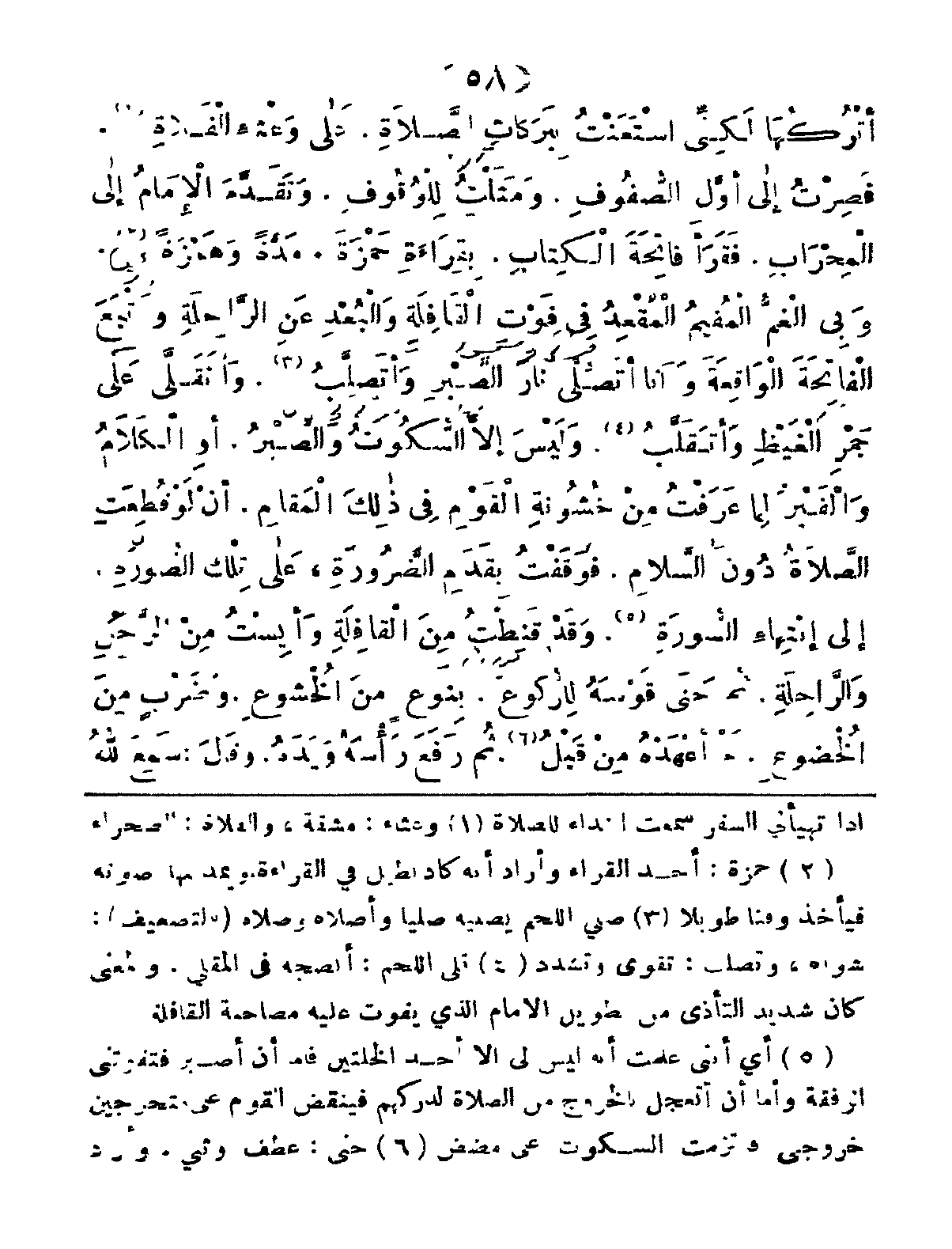 أَتْرُكَها، لَكِنِّي اسْتَعَنْتُ بِبَركاتِ الصَّلاةِ، عَلى وَعْثَاءِ الفَلاةِ، فَصِرْتُ إِلَى أَوَّلِ الصَُفُوفِ، وَمَثَلْتُ لِلْوُقُوفِ، وَتَقَدَّمَ الإِمَاُم إِلى المِحْرَابِ، فَقَرَأَ فَاتِحَةَ الكتَابِ، بِقِراءَةِ حَمْزَةَ، مَدَّةً وَهَمْزَةً، وَبِي الْغَمُّ الْمُقِيمُ الْمُقْعِدُ في فَوْتِ القَافِلَةِ، وَالبُعْدِ عَنِ الرَّاحِلَةِ، وَاتْبَعَ الفَاتِحَةَ الوَاقِعَةَ، وَأَنَا أَتَصَلَّى نَارَ الصَّبْرِ وَأَتَصَلَّبُ، وَأَتَقَلَّى عَلى جَمْرِ الغَيْظِ وأَتَقَلَّبُ، َوَلْيَس إِلاَّ السُّكُوتُ وَالصَّبْرُ، أَوِ الكَلاَمُ وَالْقَبْرُ؛ لِمَا عَرَفْتُ مِنْ خُشُونَةِ القَومِ فِي ذَلكَ المَقامِ، أَنْ لَوْ قُطِعًتِ الصَّلاةُ دُونَ السَّلام، فَوَقَفْتُ بِقَدَمِ الضَّرُورَةِ، على تِلْكَ الصُّورَةِ إِلَى انْتِهَاءِ السُّورَةِ، وَقَدْ قَنِطْتُ مِنَ القَافِلَةِ، وَأِيِسْتُ مِنَ الرَّحْلِ وَالرَّاحِلَةِ، ثُمَّ حَنَى قَوْسَهُ لِلْرُّكُوع، بِنَوْعِ مِنَ الخُشُوعِ، وَضَرْبٍ من الخُضُوعِ، لَمْ أَعْهَدْهُ مِنْ قَبْلُ، ثُمَّ رَفَعَ رَأَسَهُ وَيَدَهُ، وَقَالَ: سَمِعَ اللهُ