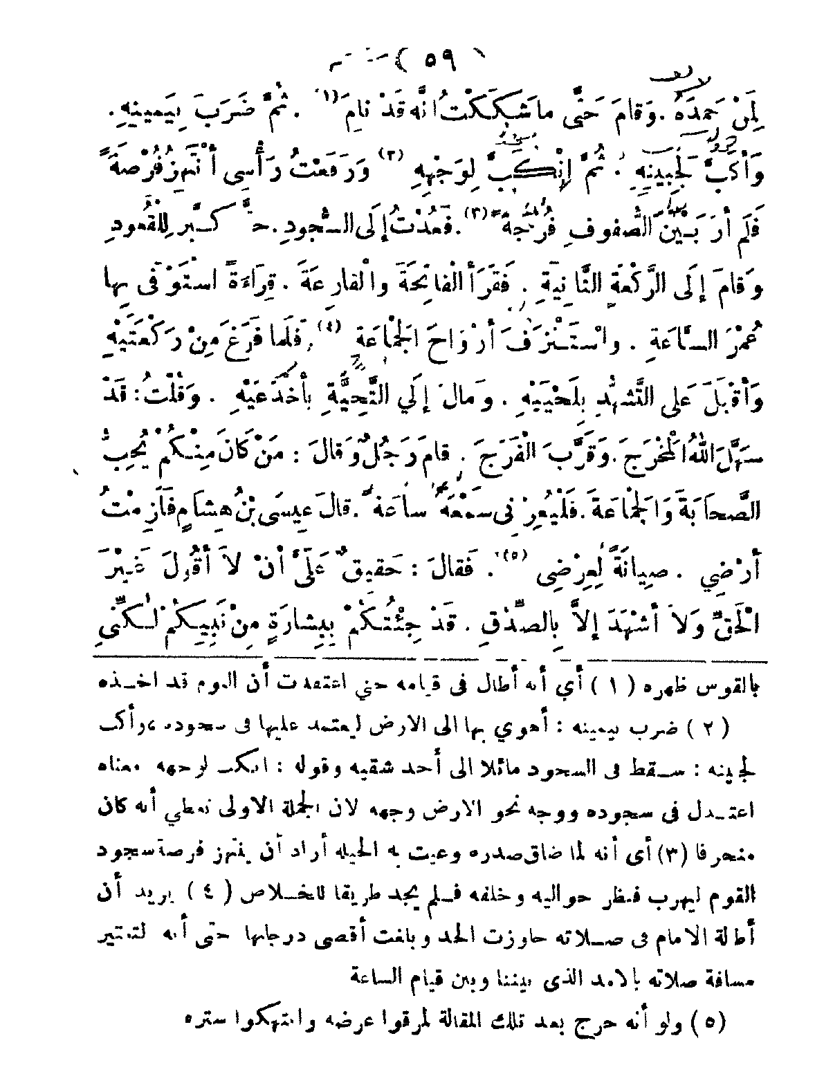لِمَنْ حَمِدَهُ، وَقَامَ، حَتَّى مَا شَكَكْتُ أَنَّهُ قَدْ نَامَ، ثُمَّ ضَرَبَ بِيَمِيِنِهِ، وَأَكَبَّ لِجَبِيِنهِ، ثُمَّ انْكَبَّ لِوَجْهِهِ، وَرَفَعْتُ رَأَسِي أَنْتَهزُ فُرْصةً، فَلَمْ أَرَ بَيْنَ الصُّفُوفِ فُرْجَةً، فَعُدْتُ إِلَى السُّجُودِ، حَتَّى كبَّر لِلْقُعُودِ، وَقامَ إِلى الرَّكْعةِ الثَّانِيَةِ، فَقَرَأَ الفَاتِحَةَ وَالقَارِعَةَ، قِرَاءَةً اسْتَوْفَى بِها عُمْرَ السَّاعَةِ، وَاستَنْزَفَ أَرْوَاحَ الجَمَاعَةِ، فَلَمَّا فَرِغَ مِنْ رَكْعَتَيْهِ، وَأَقْبَلَ عَلى التَّشَهُّدِ بِلَحْيَيْهِ، وَمَالَ إِلَى التَّحِيَّةِ بِأَخْدَعَيْهِ، وَقُلْتُ: قَدْ سَهَّلَ اللهُ الَمْخرَجَ، وَقَرَّبَ الفَرَجَ، قَامَ رَجُلٌ وَقَالَ: مَنْ كانَ مِنْكُمْ يُحِبُّ الصَّحَابَةَ والجَمَاعَةَ، فَلْيُعِرْنِي سَمْعَهُ سَاعَةً.