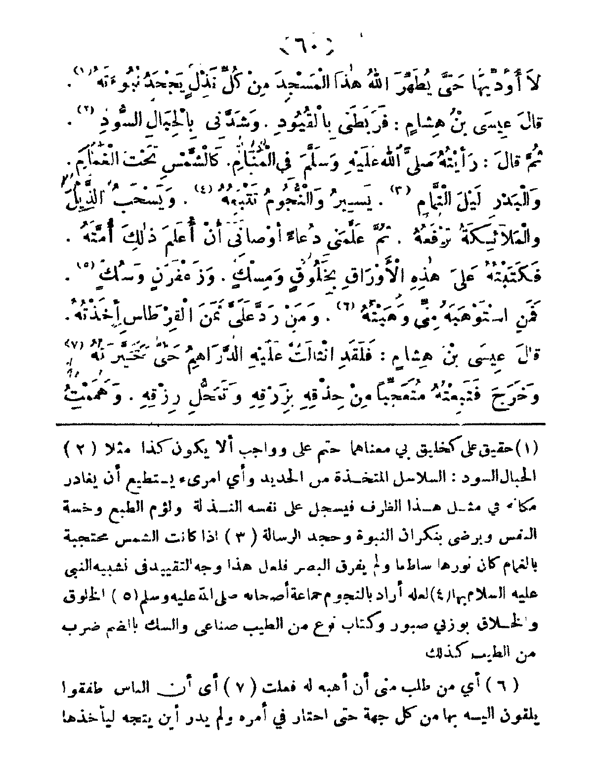 قَالَ عِيسَى بْنُ هِشَامٍ: فَرَبَطني بِالْقُيُودِ، وَشَدَّني بِالحِبَالِ السُّودِ، ثُمَّ قَالَ: رأَيْتُهُ صَلَّى اللهُ عَلَيْهِ وَسَلَّمَ فِي المَنَامِ، كالشَّمْسِ تَحْتَ الغَمامِ، وَالبَدْرِ لَيْلَ التَّمَامِ، يَسِيرُ وَالنُّجُومُ تتَبْعَهُ، ويَسْحَبُ الذَّيْلَ والمَلائِكَةُ تَرْفَعُهُ، ثمَّ علَمَني دُعَاءً أَوْصَانِي أَنْ أُعَلِّمَ ذَلِك أُمَّتَهُ، فَكَتَبْتُهُ عَلَى هذِهِ الأَوْرَاق بِخَلُوقٍ وَمِسْكٍ، وَزَعْفَرَانٍ وَسُكٍ، فَمَنِ اسْتَوْهَبَهُ مِنيِّ وَهَبْتُهُ، وَمَنْ رَدَّ عَلَيَّ ثَمَنَ القِرْطَاسِ أَخَذْتُهُ.